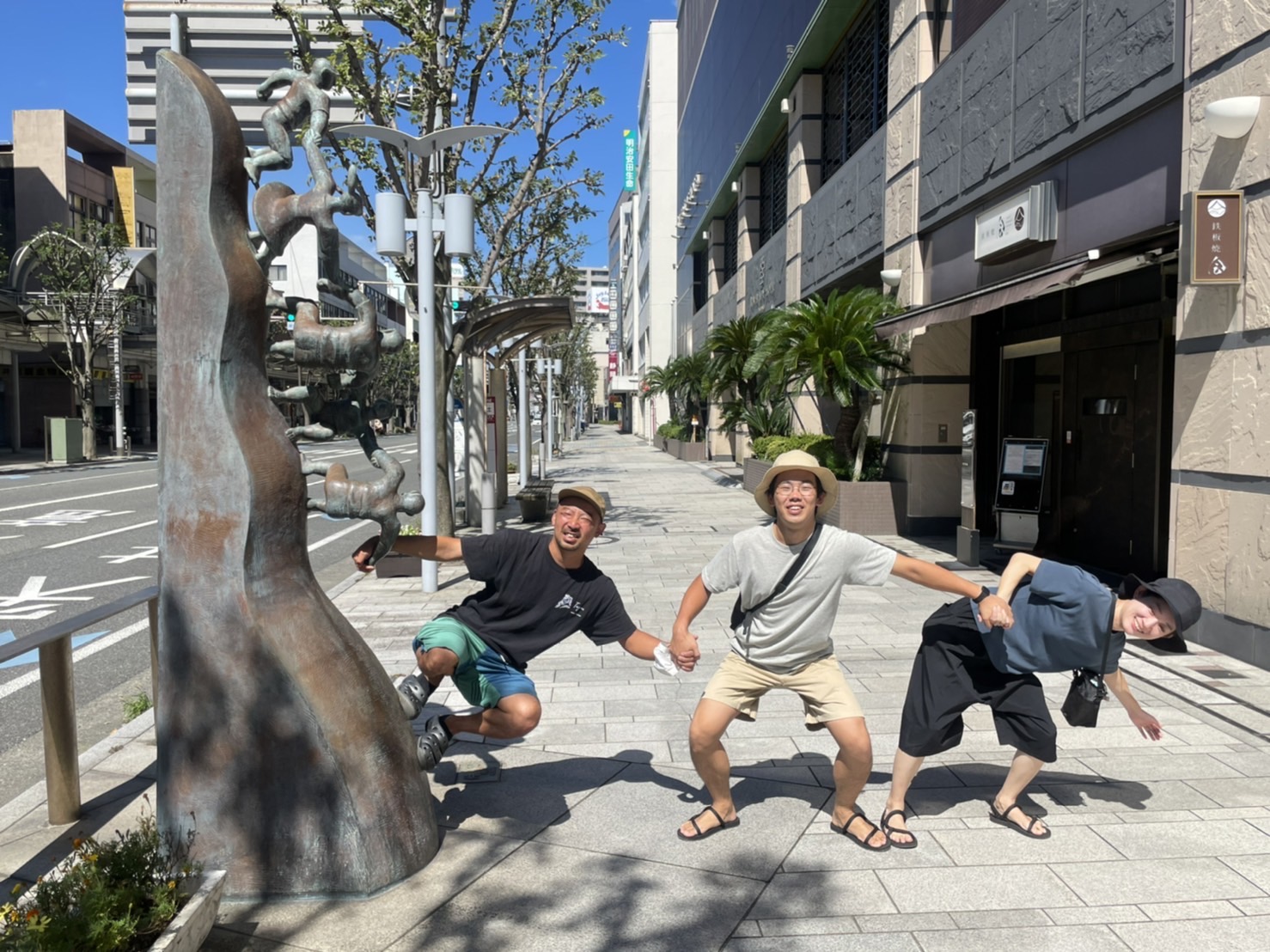 6人めに混ぜていただいた。仲間。きょうの沼津は風が強くて歩行者は少なめ。左からしまやん@ぬまつー、こもりん@ぬまつー、しゅーこ@ぬまつー。こうして狙ってふざけている時こそ特に、ぬまつー読者のみなさまには見つかりたくないものです。ご報告:ここ最近、ぬまつーライターそれぞれがネタを探してマチをうろうろしていると「ぬまつーのヒトですよね?」と声をかけていただけることが増えてきました笑。きのうの夜も!かのがわ風のテラスでのウェディングパーティーのお手伝いしていたら「いろいろと沼津の情報が役にたってますよ」と泣。ありがとうございます泣。ライター陣の励みになりますので、沼津の「マチ」で見かけたときにはぜひお声がけください!ヌマンクシーステッカー(勝手にしまやん作るつもり)がもらえる・・・かもー♪