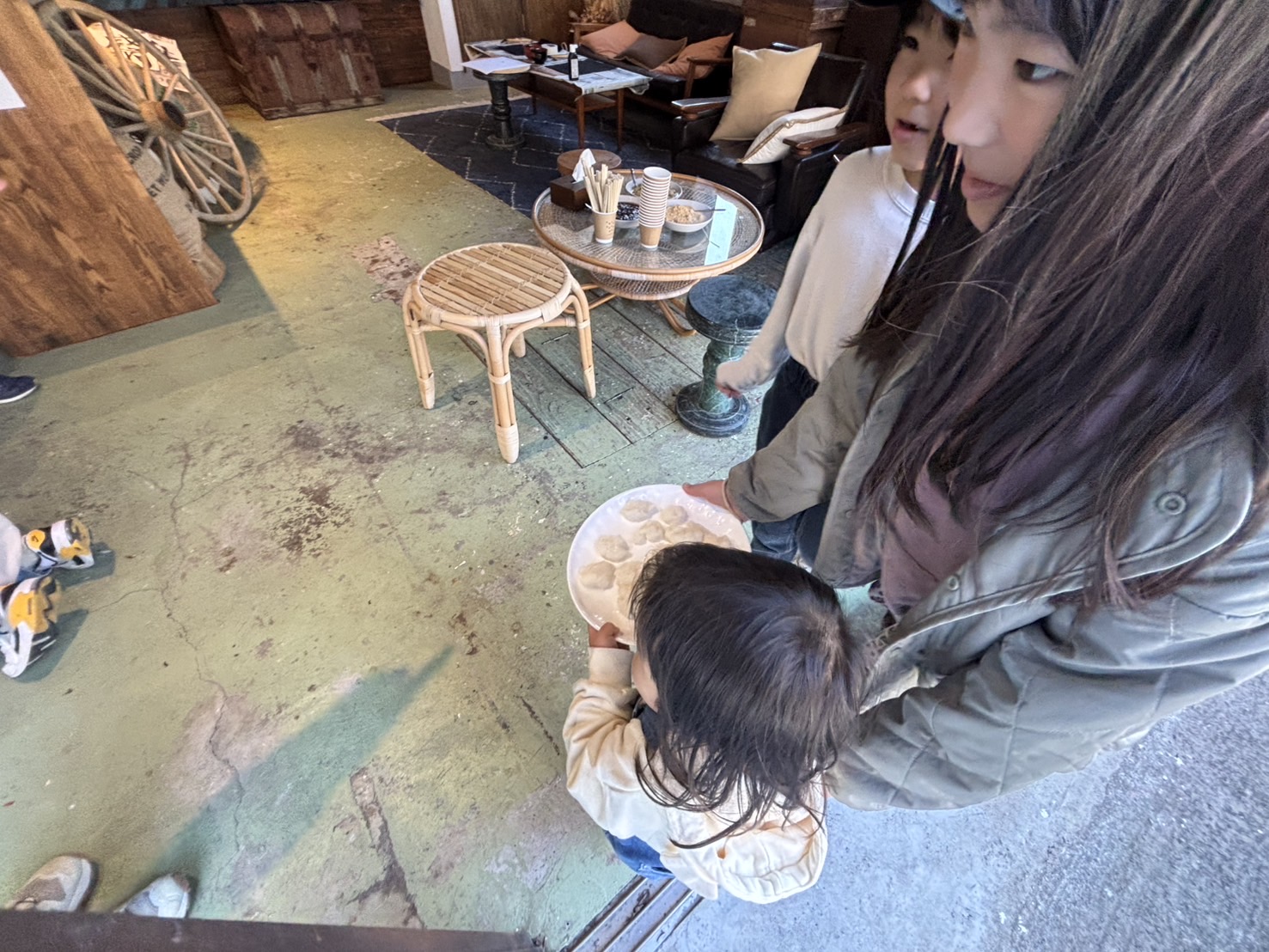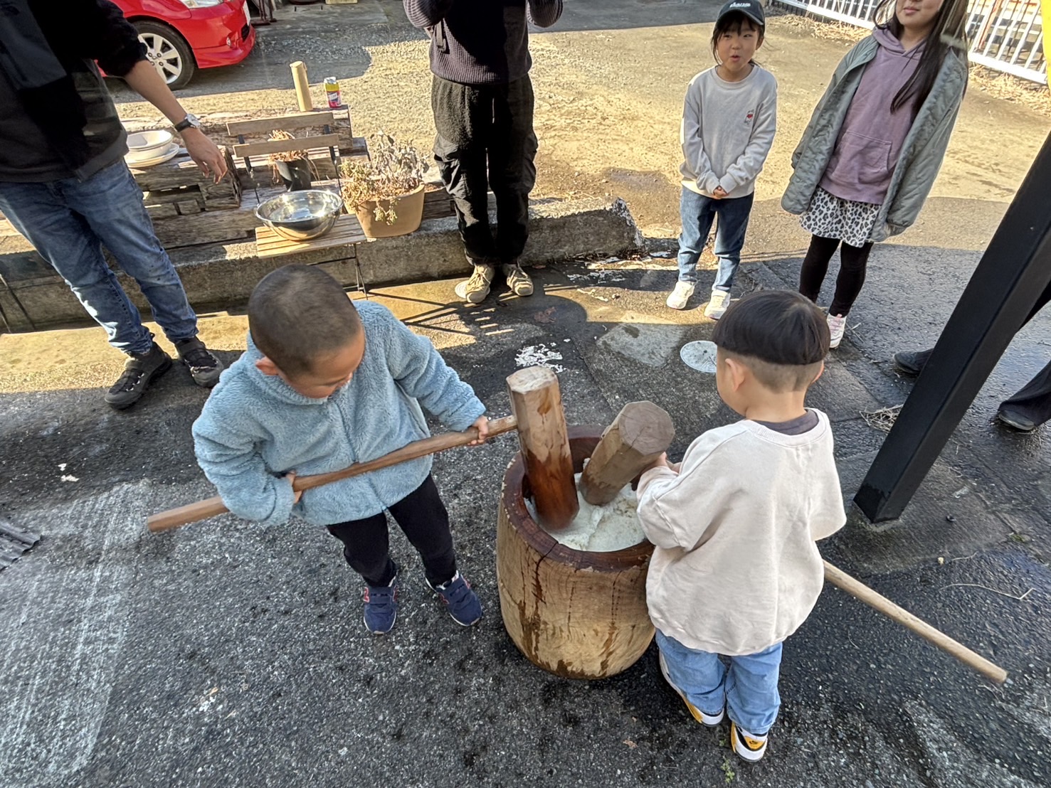 子どもたちがぐりぐりこねこねして、餅をつく前の準備からやってくれてるのがすごくかわいかった。