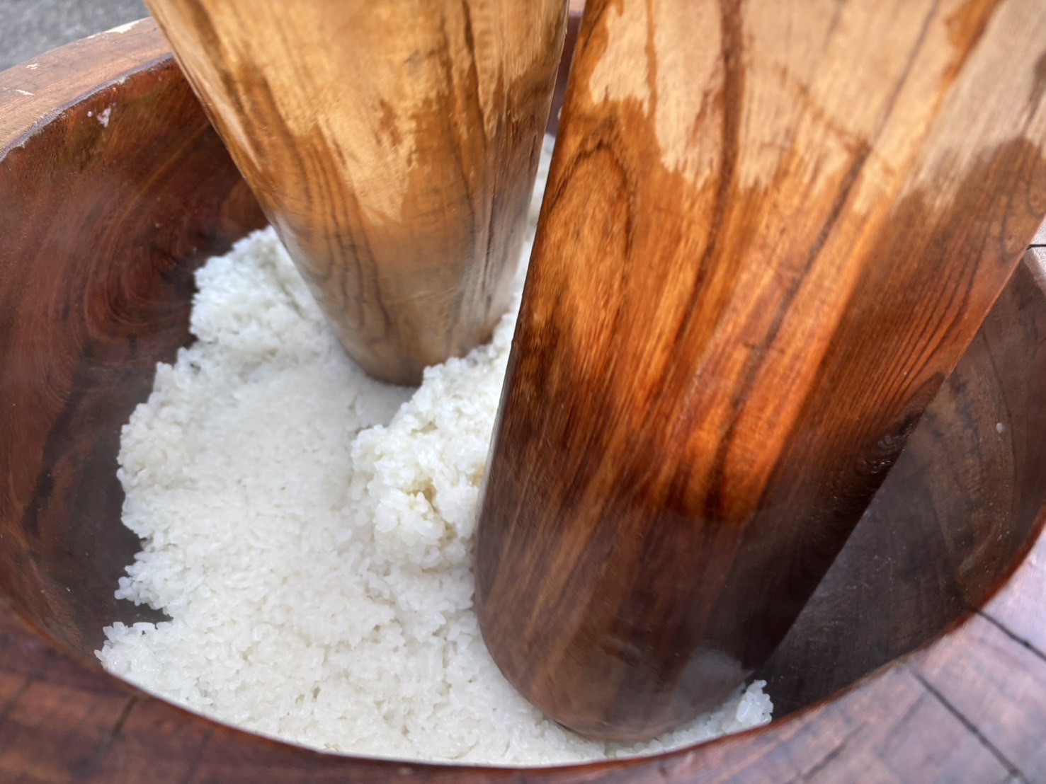 お昼12:30頃に到着。もち米はすでに蒸してくれてあって、すぐに餅つき開始。