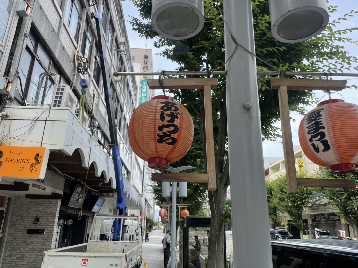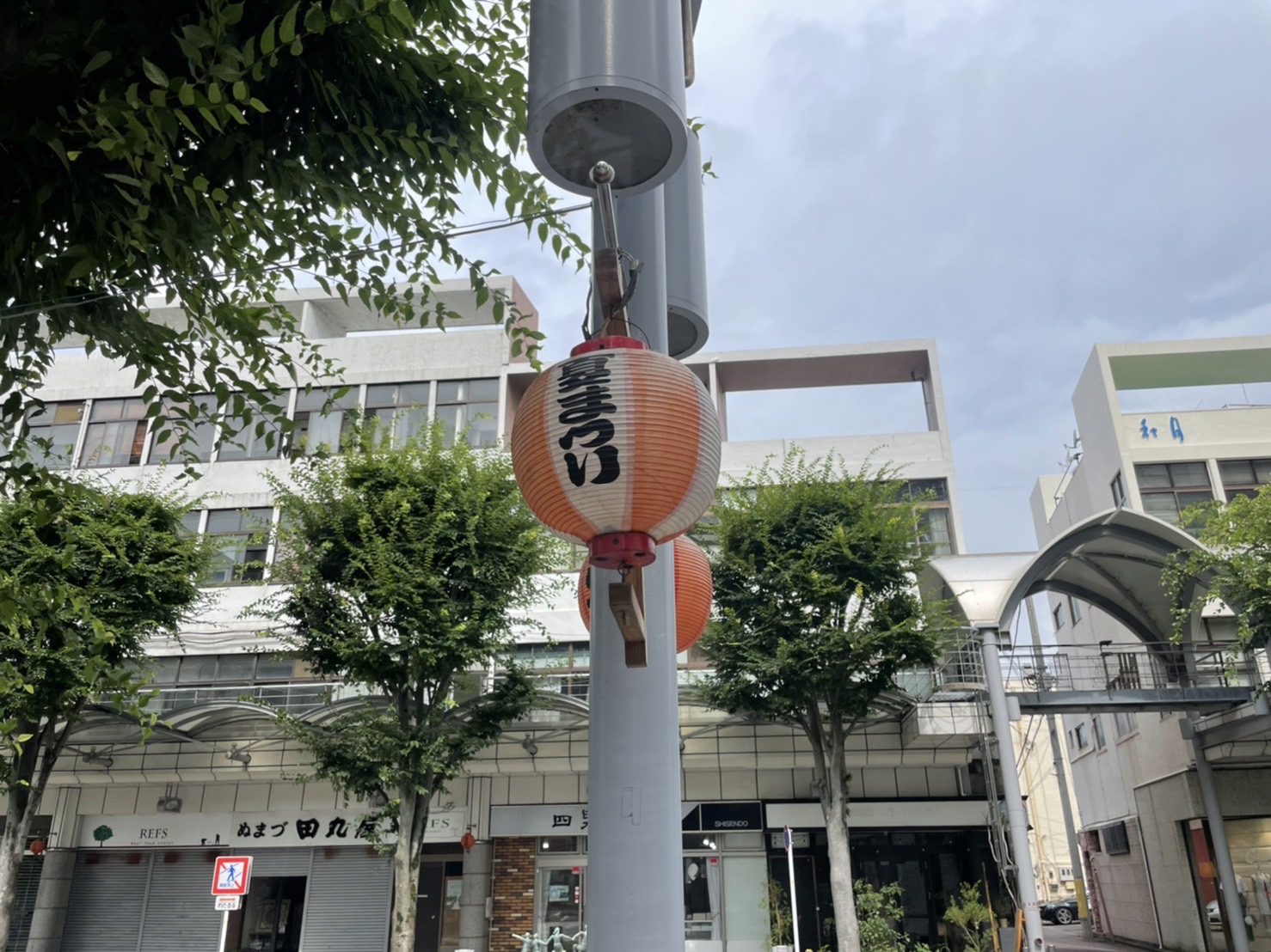 ちょっとずつお祭りムードになってきてる。リバーサイドホテルらへん。花火は19:30~20:15予定だそう。(沼津市上土町)
