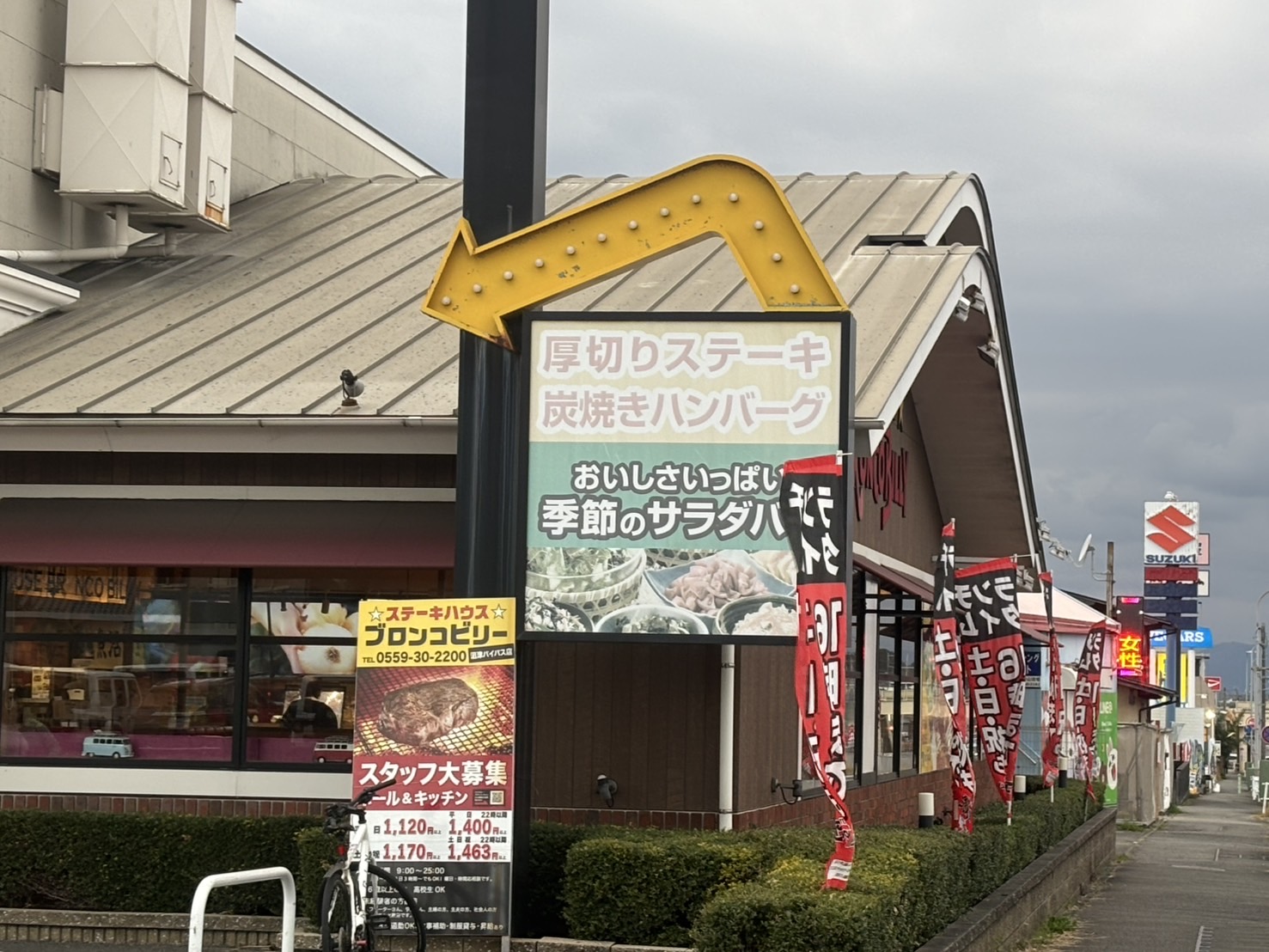 国1沿いにあるブロンコビリー沼津バイパス店。けっこう遅くの23時までやってる。まだ行ったことないので、行ってみたい。(沼津市東熊堂)