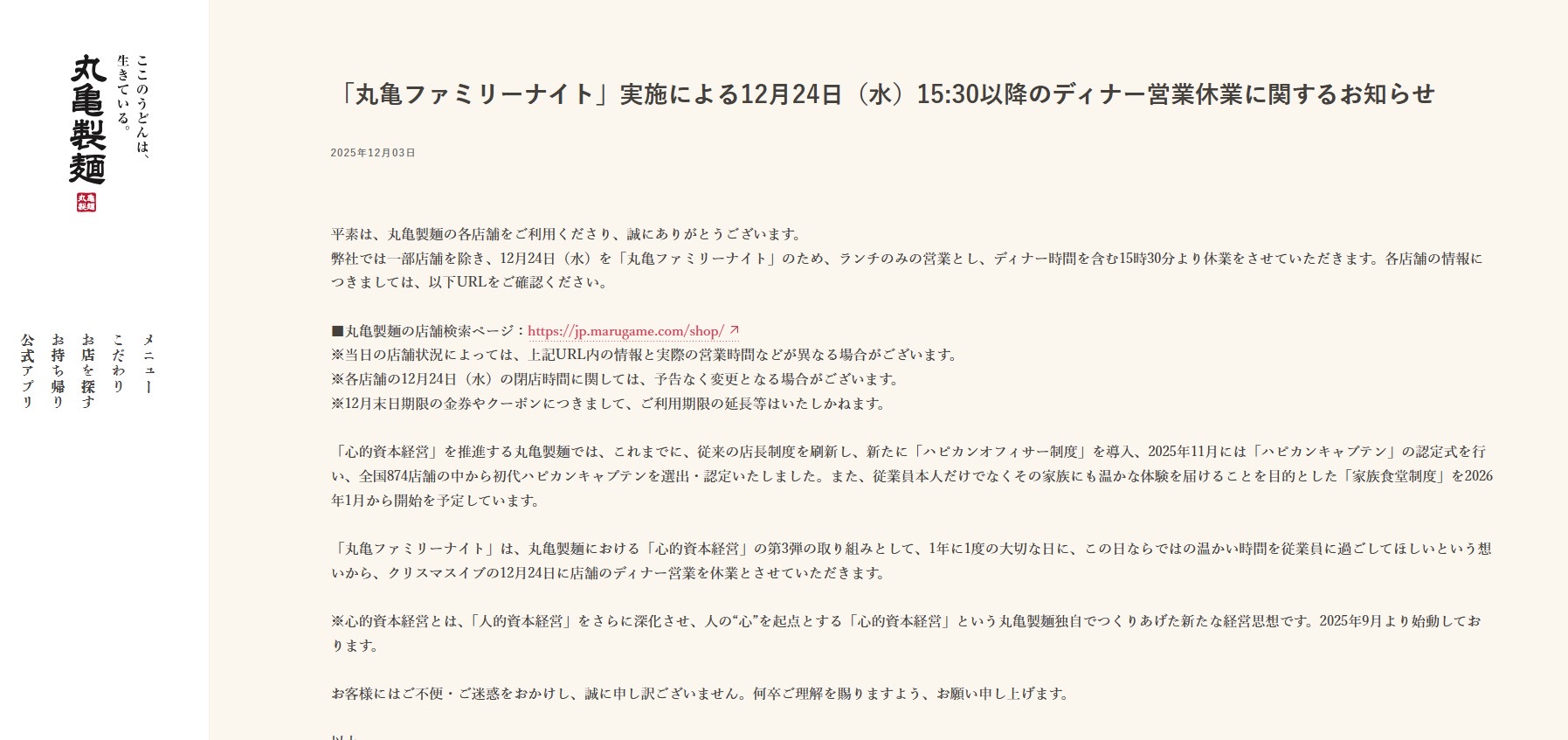 「丸亀ファミリーナイト」は、丸亀製麺における「心的資本経営」の第3弾の取り組みとして、1年に1度の大切な日に、この日ならではの温かい時間を従業員に過ごしてほしいという想いから、クリスマスイブの12月24日に店舗のディナー営業を休業とさせていただきます。。