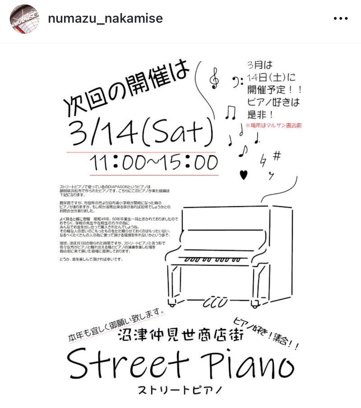 3/14(土)11:00~15:00でストリートピアノが設置されるって。設置の経緯を聞いたら、泣けた。沼津仲見世商店街。(沼津市大手町)