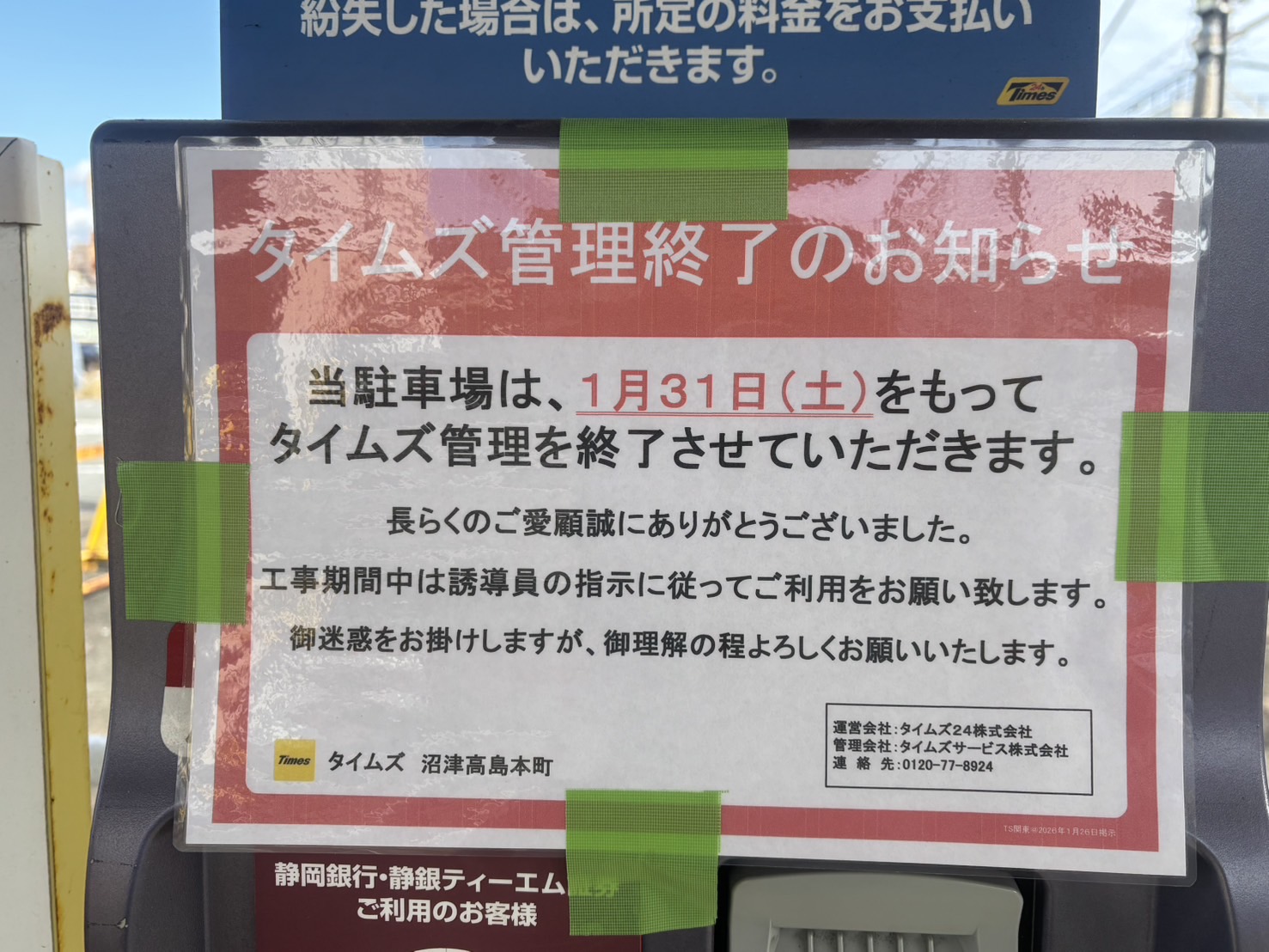 【閉店】きょう31(土)でタイムズ管理終了だって。イシバシプラザだったところの駐車場。タイムズ沼津高島本町。(沼津市高島本町)