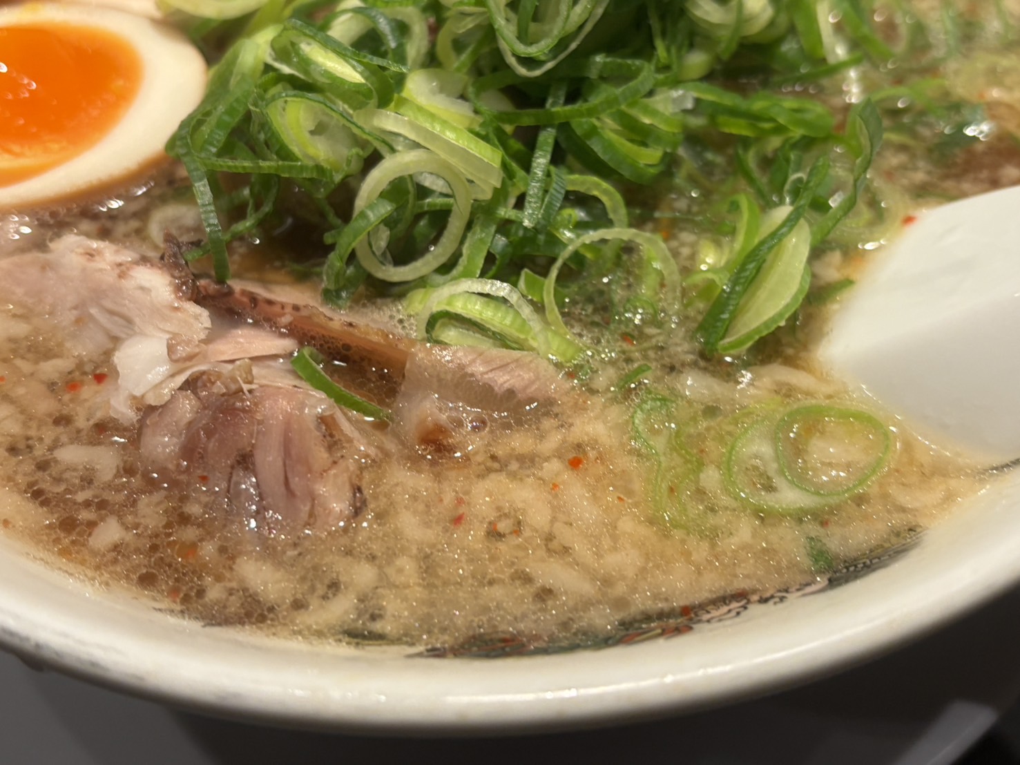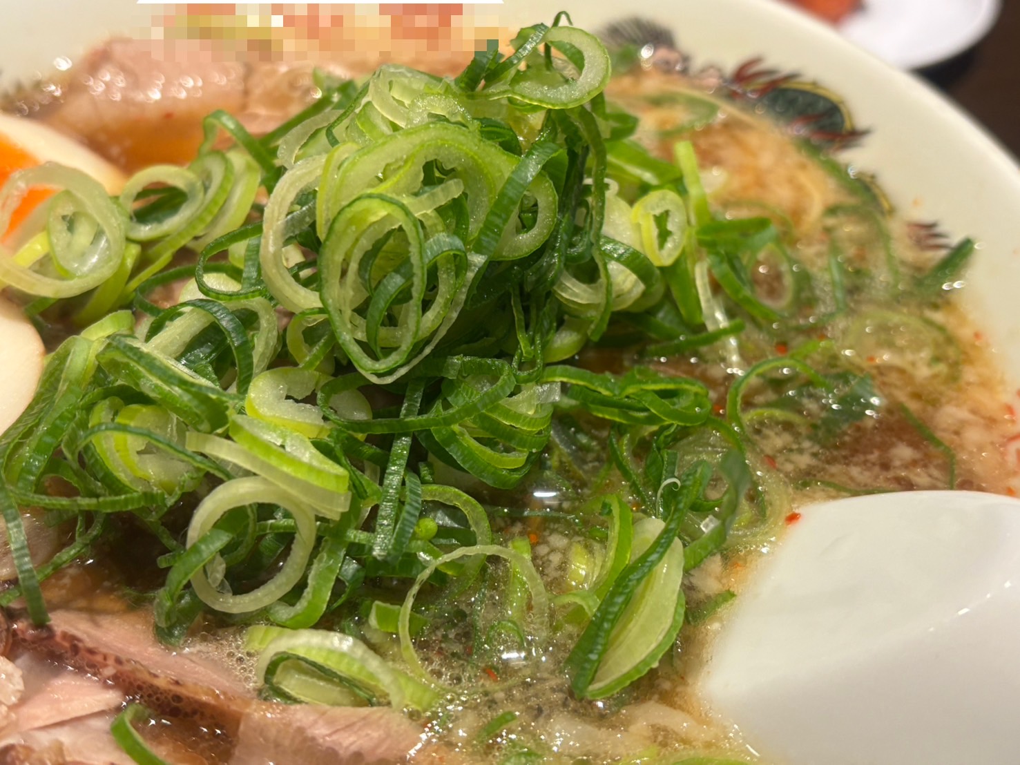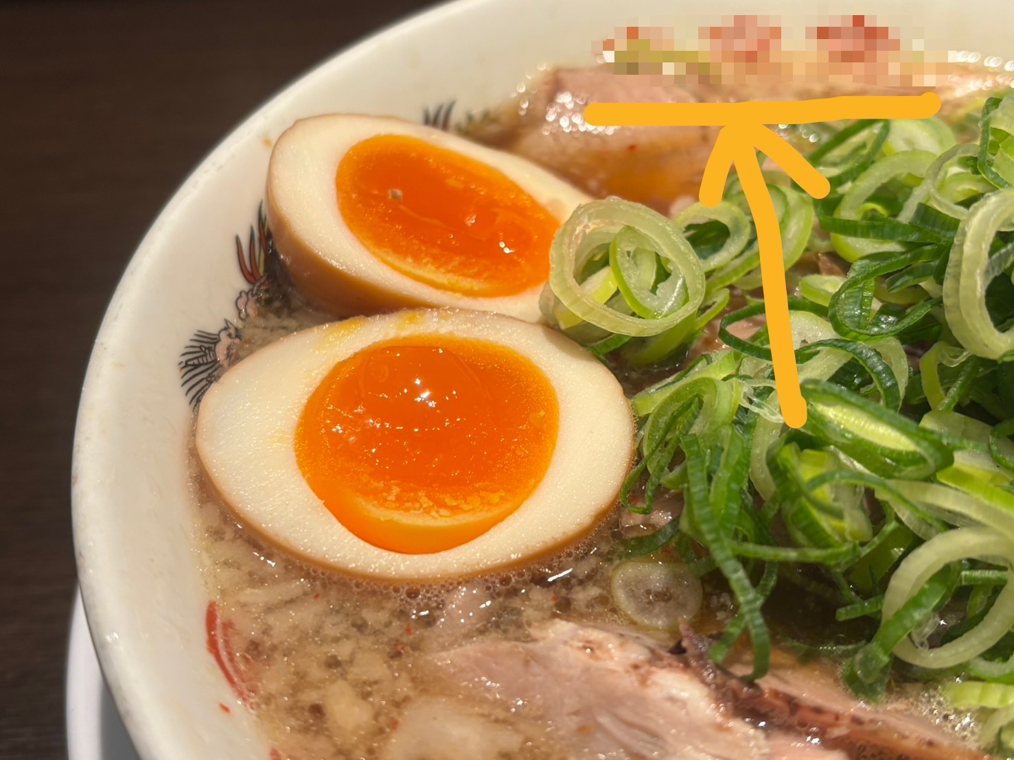 続いて、ヒント2。味玉子。黄身がちょうどいい感じでうまい。どんぶりにはお店の名前が書いてあるので・・・モザイク。