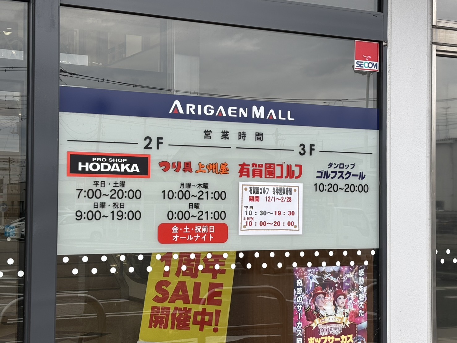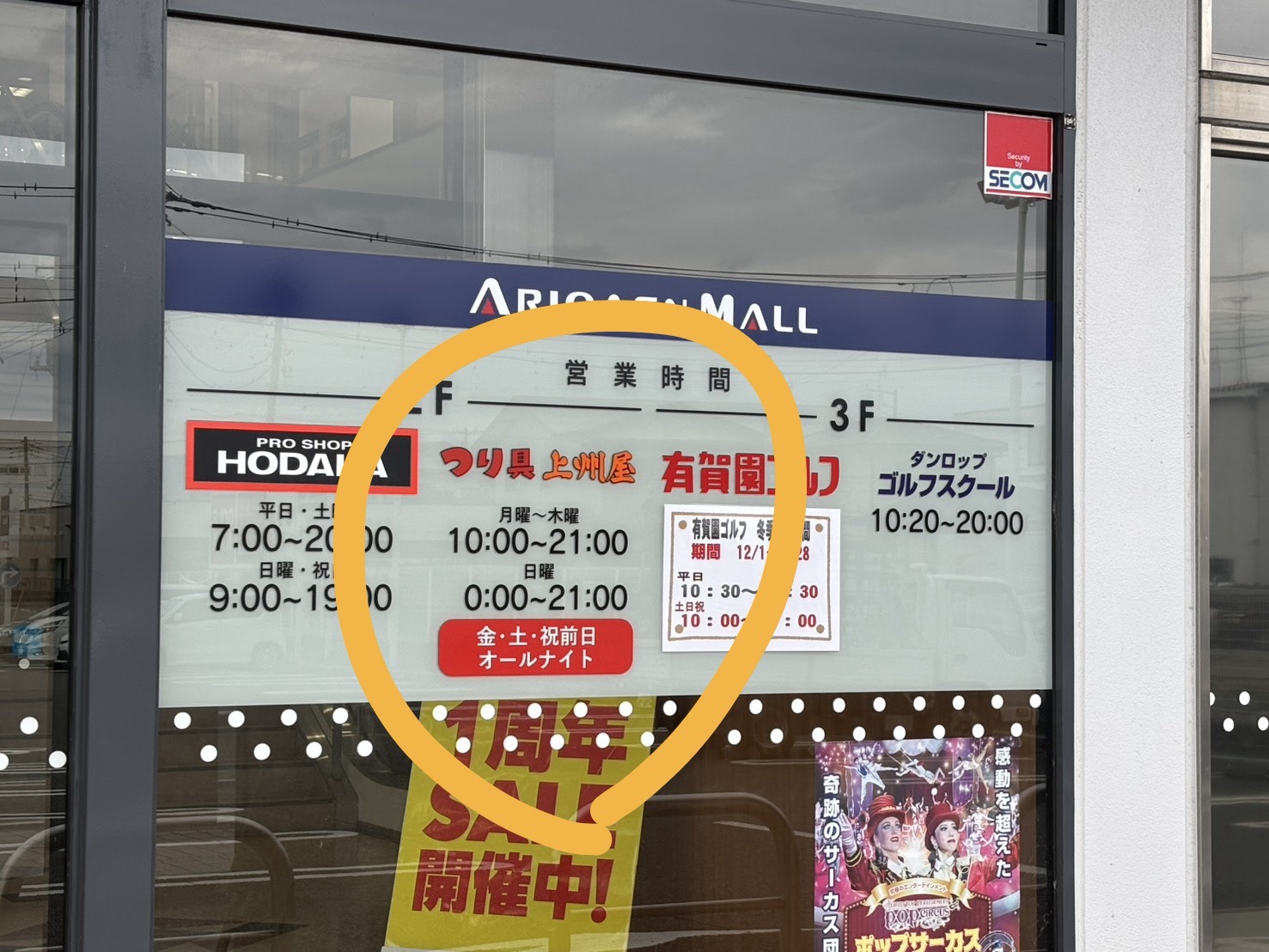 そのお店のひとつ。つり具上州屋の営業時間が・・・すごい。