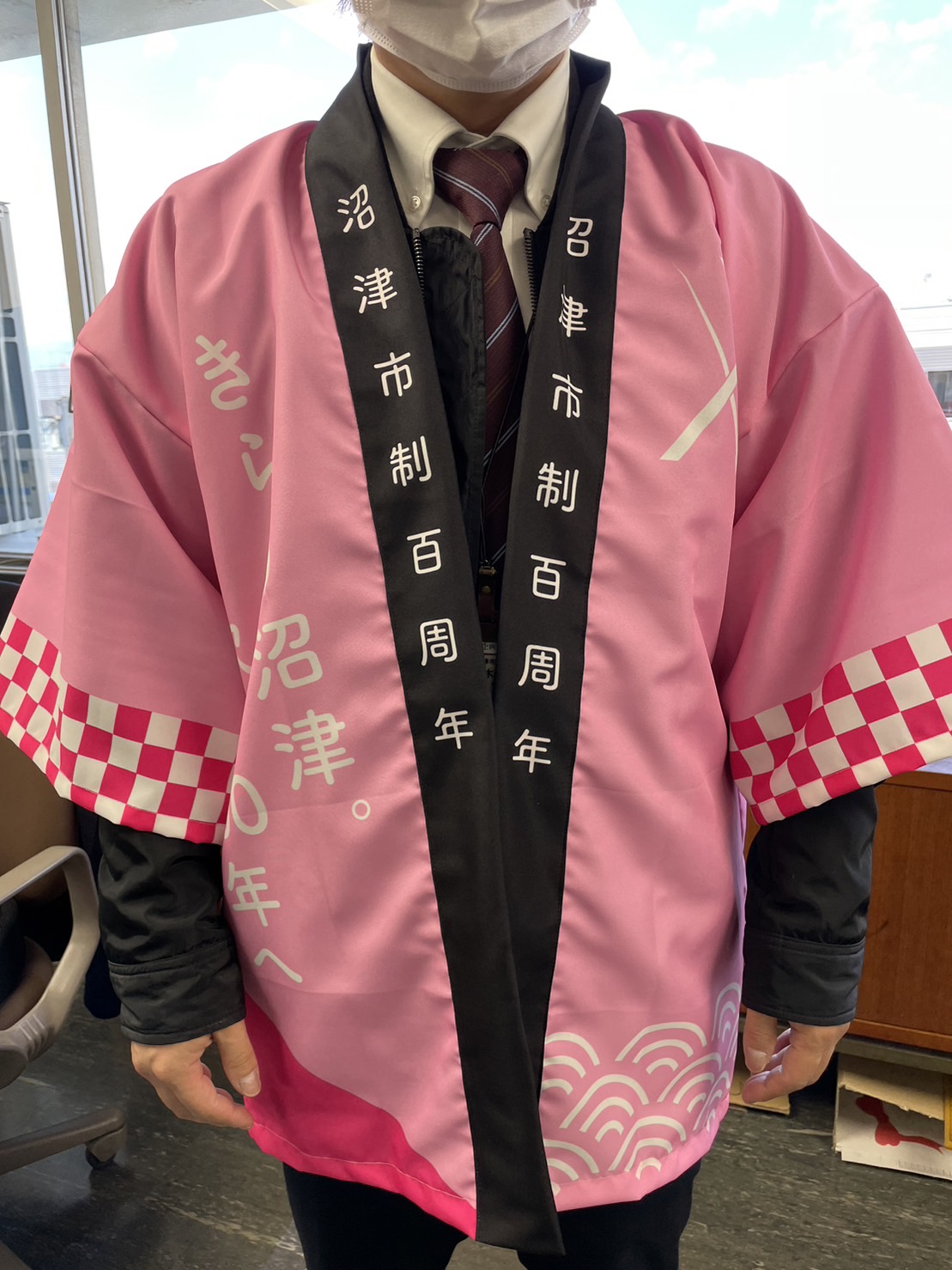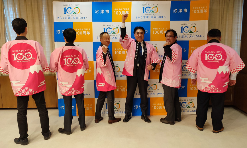 市制100周年記念はっぴができてる。これを着ると市長もみんなもテンション高め。