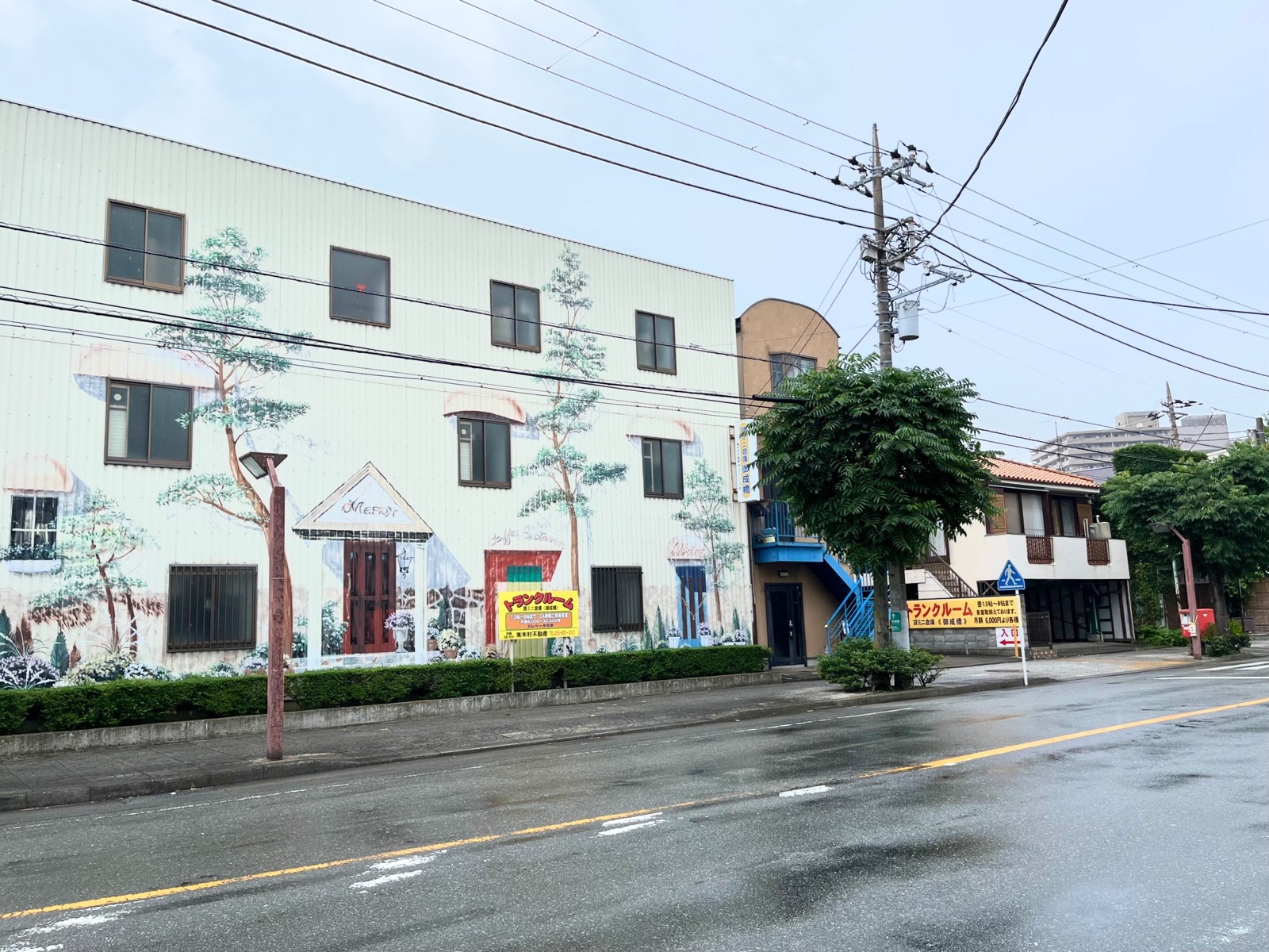入ろうと思ったら壁やないか〜い、とまやかしの壁面アートが描かれた貸しミニ倉庫のあるあたり。