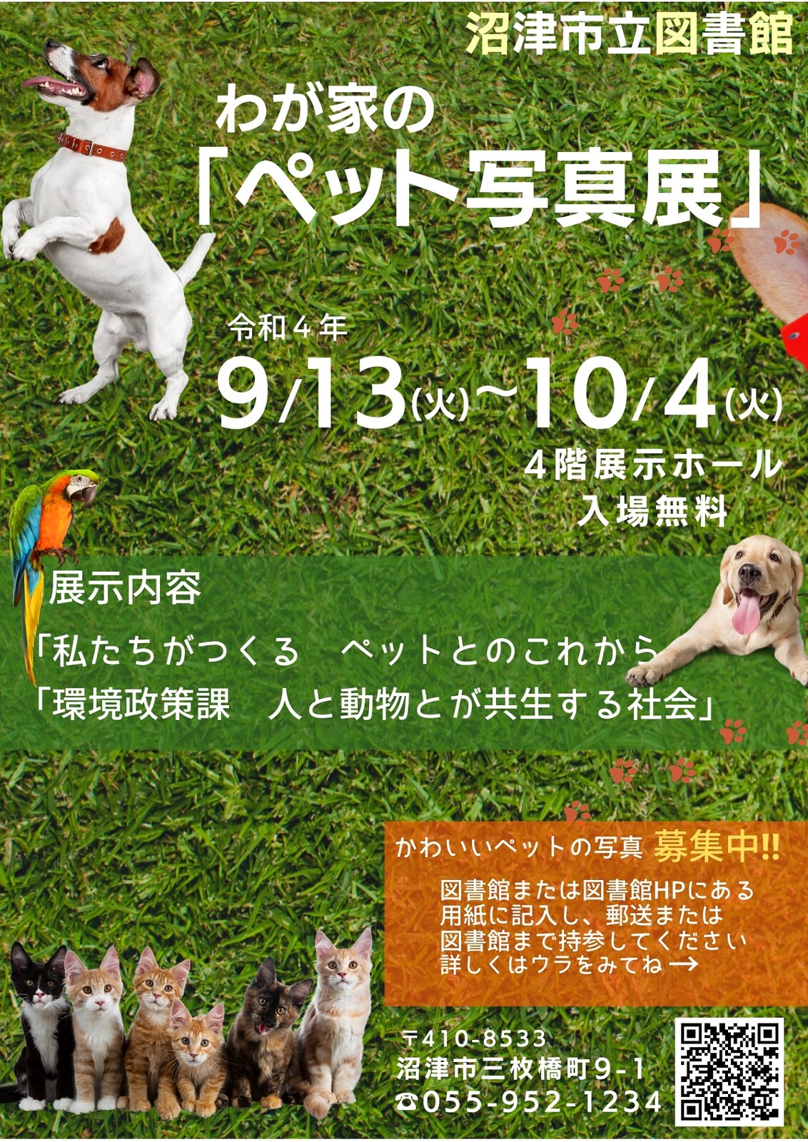 9月の20日から26日は動物愛護週間!ということで、沼津市立図書館で「わが家のペット写真展」を開催するみたい。昨年は似たような企画をサンウェルぬまづでやっていたような…。
