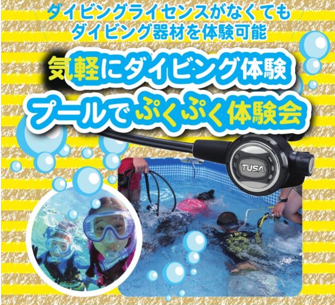 まずひとつ目は、水の中でシュコー!と呼吸するアレの体験。水中マスクをつけ、レギュレーターというダイビングの呼吸器を口にくわえて、浅いプールでダイビング体験ができちゃうというなんとも面白そうなイベント。