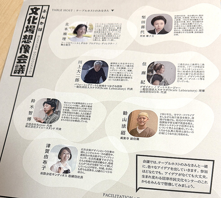 会議には、ぬまつーでもちょいちょい見かける建築士のすずきさんや舞台・音響の専門家などもテーブルホストとして参加するようで、多角的な視点から文化センターを“文化場”としてどう活かすかを話し合う機会になりそうな予感。