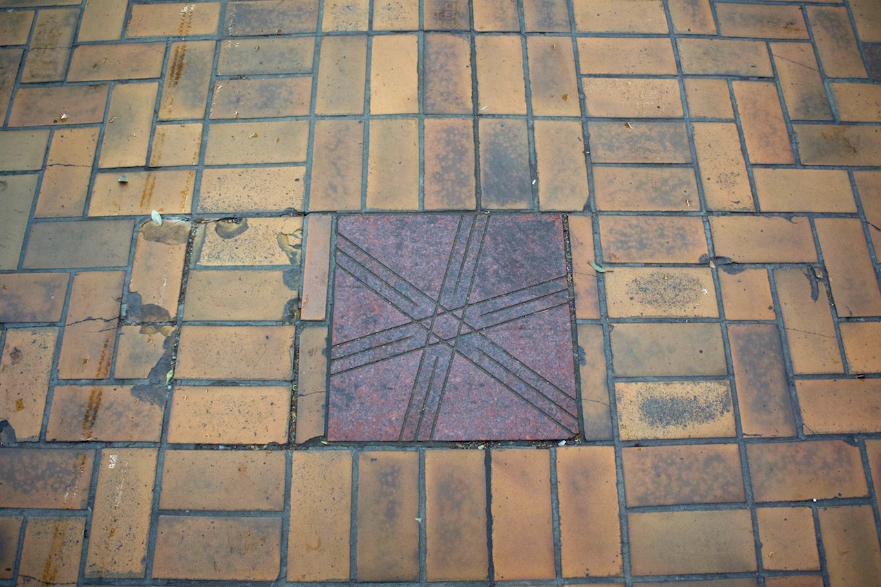 車道と交差する部分は、たぶん強度の高い大型タイル。マンホールを中心に、きちんと模様になっています。