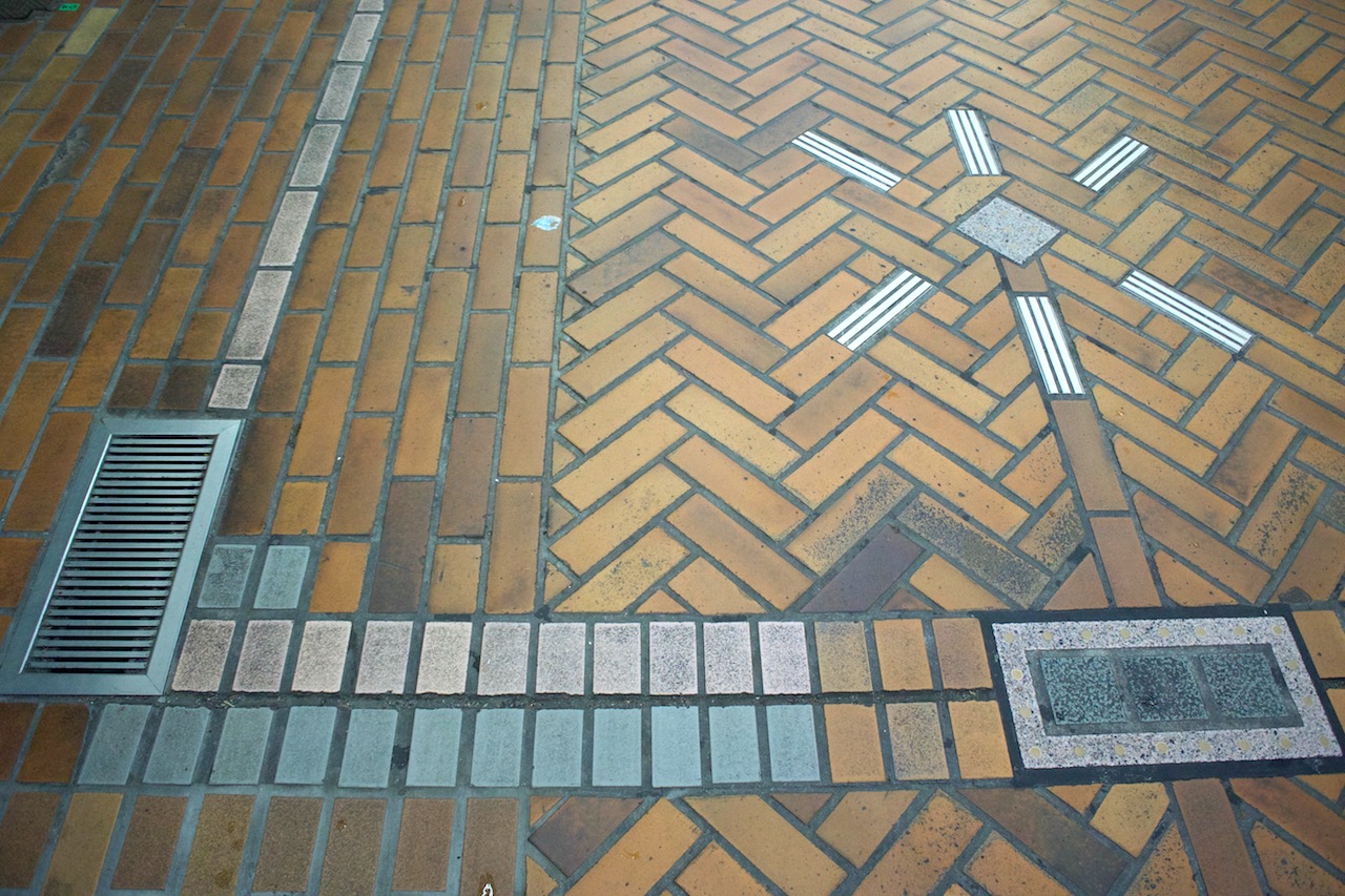 まずは、メイン部分。中央がフィッシュボーンで、サイドがレンガ組なのは、歩く人(中央)と、商品を見る人(サイド)で棲み分けをしているからでしょうか。