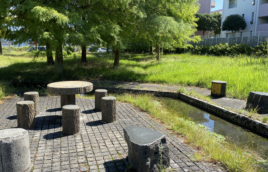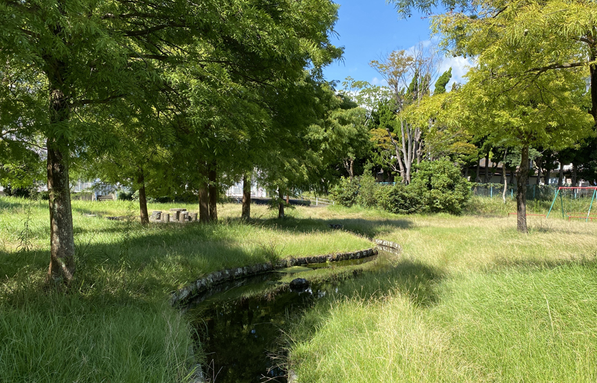 原団地の一角にあり、団地の広場に湧水が湧き出ているというレアな公園。広めの公園内に申し訳程度に設置された遊具。