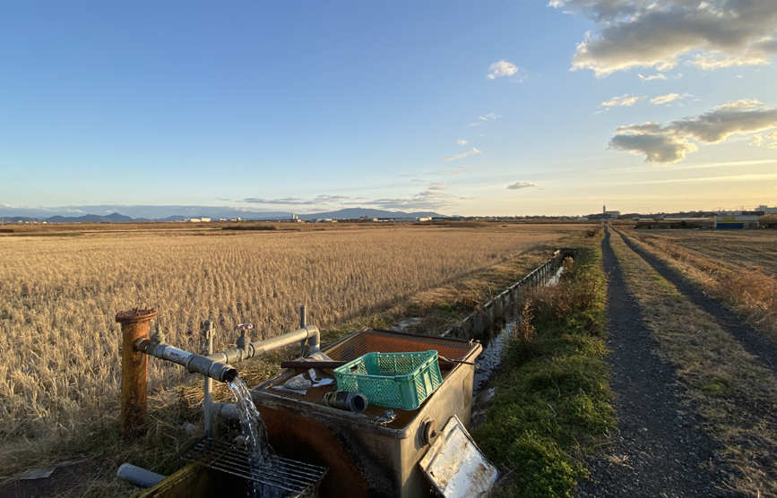 田んぼのなかにポツン系の湧水スポットのなかでは、青野4号に次ぐ湧水量を誇るドバドバ系の湧水です。おそらくは自噴系の湧水で、風呂桶のようなものに向けてかなりの量が湧き出ています。