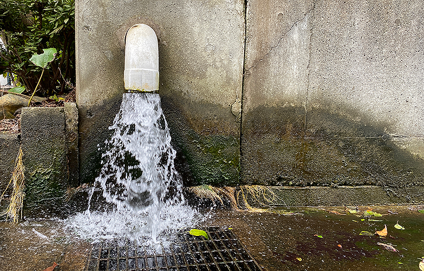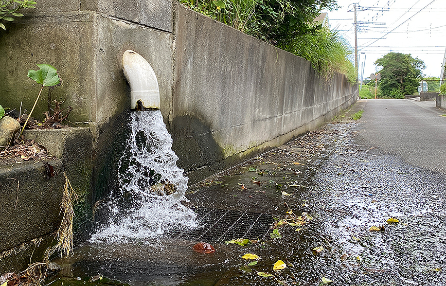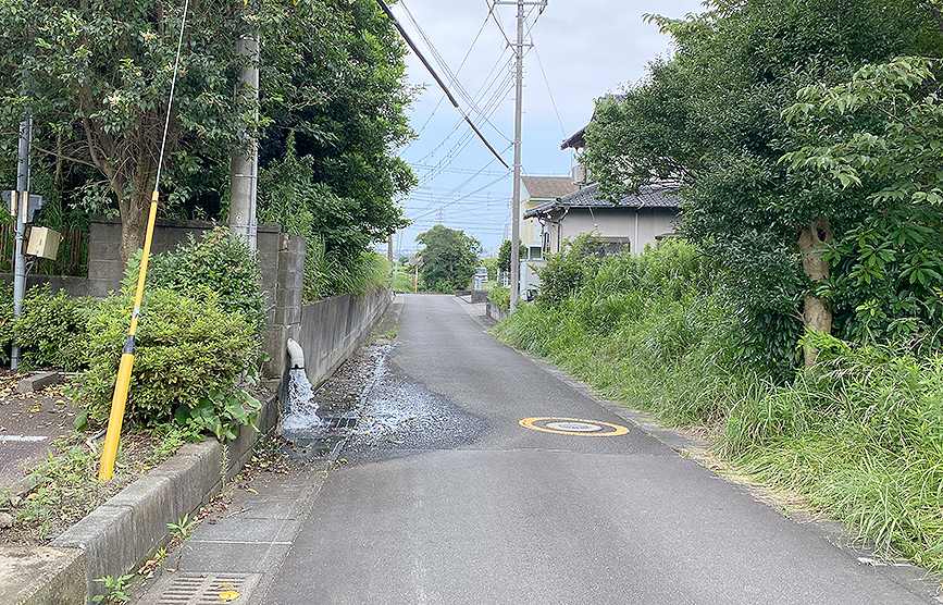 比較的車通りも少ない道の脇で、グレーチングに向けて水を吐き出しているものの、その勢いがすごすぎて、道路を濡らしています。