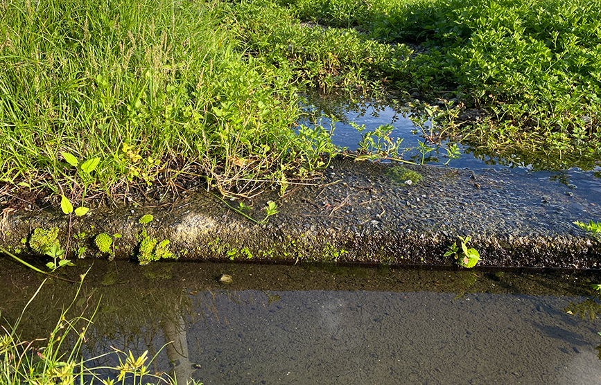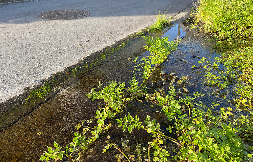 濡れた路面を見つけ、恐る恐る近づいてみると駐車場の脇に発見しました、ひゃっこい!湧水。