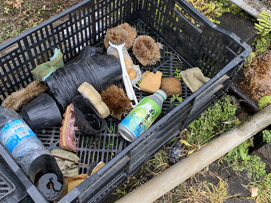 農具を洗うためのものでしょうか、たわしも完備。ぬまっちゃの空き缶があるのも気がきいてますね。