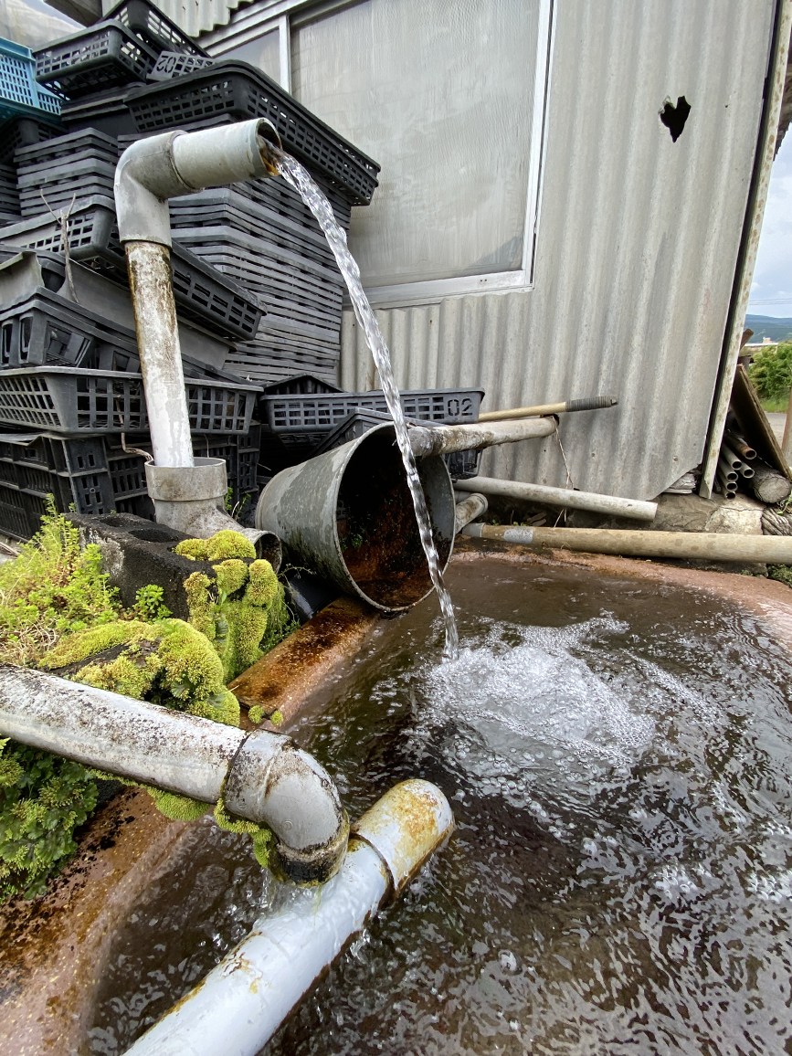台所にあるシンクみたいなところへ向けて、それなりの高さから落ちている湧水。よく見るとパイプみたいなものが3本、4本と突き出ていて、それぞれ水を吐き出しています。