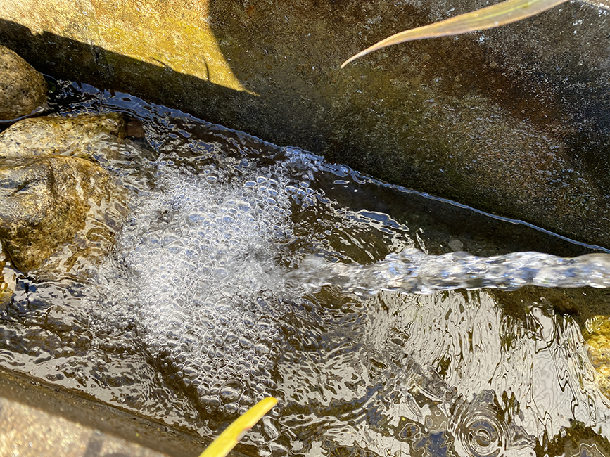 ししおどしを思わせるようなパイプから結構直線的に流れ出しています。前に来たときとちょっとスタイルが変わってるな…。流れ落ちるサウンドもいい感じ。
