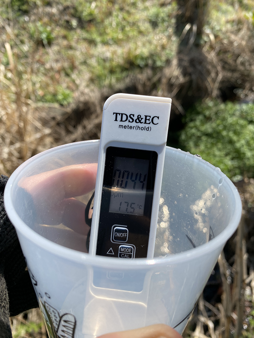 水温を測定してみると17.5℃をマーク。春が近づいてきたのかやや高めのスコアです。注目すべきは水質のキレイさ。44ppmとかなりのハイスコアです。