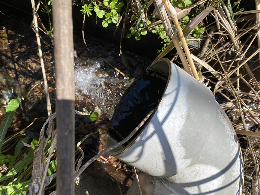 やや太めの塩ビ管からドボドボと湧き出る湧水。けっこうな透明度を誇ります。