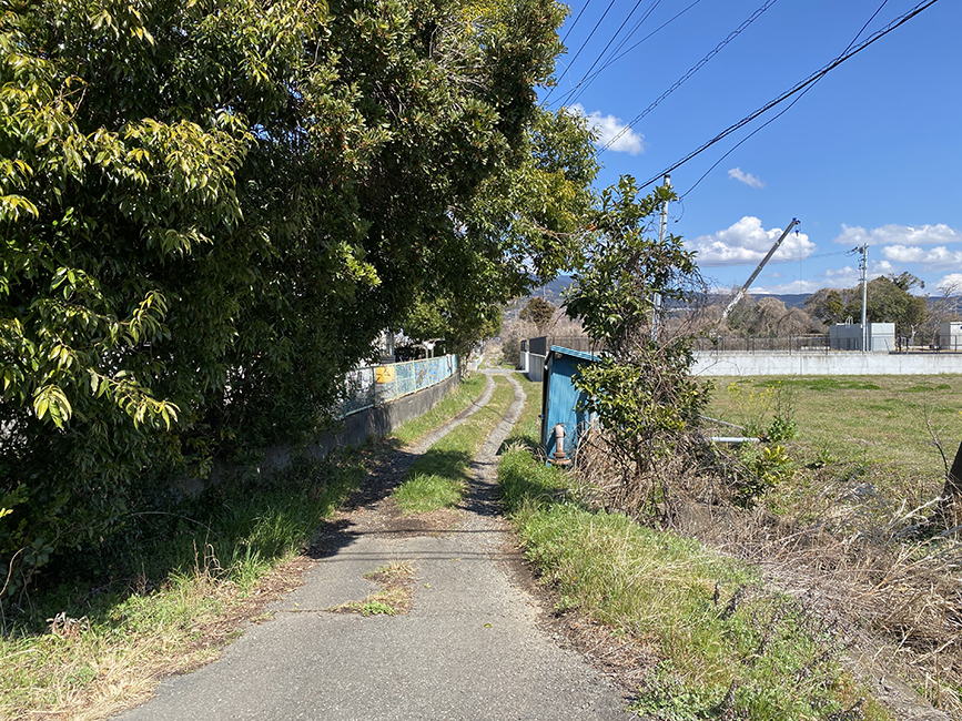 田んぼと田んぼの間のあぜ道。似たような道がたくさんあるので気を抜いていると通り過ぎてしまうのでご注意ください。