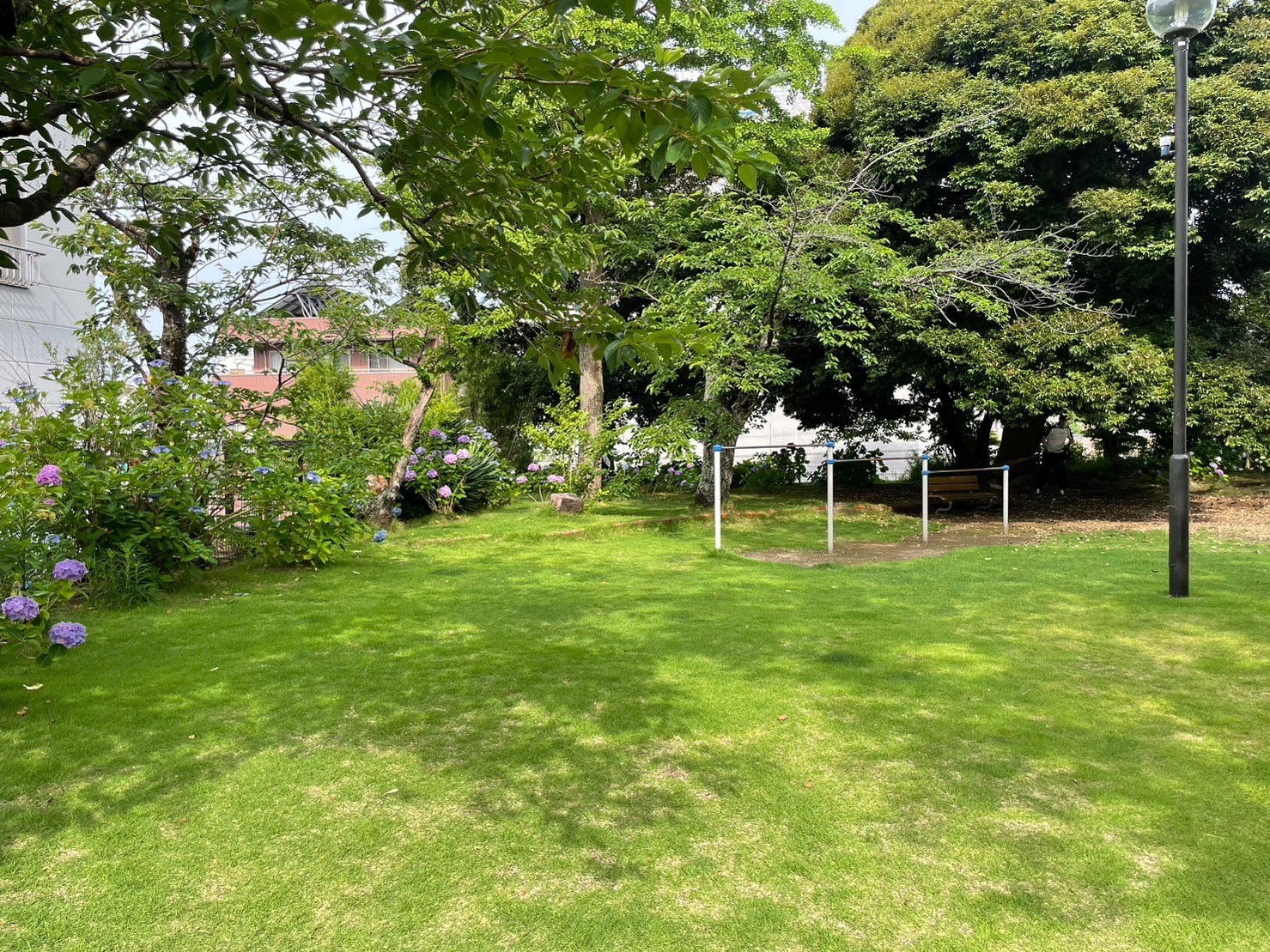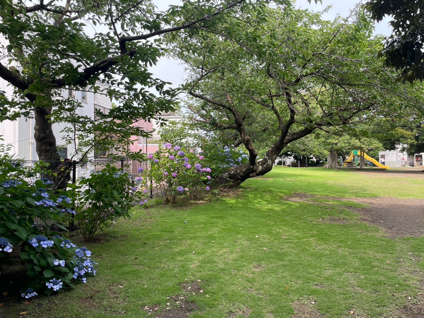 鉄棒の近くにも咲いていて、晴れてる日に行くとさらにきれい。梅雨の合間の晴れは気持ちがいい。