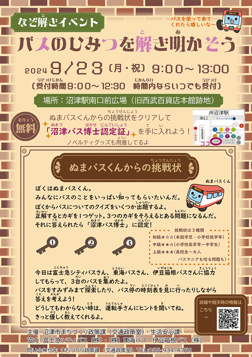 ぬまバスくんからの挑戦状!バスの日イベントにちなんだ「なぞ解きイベントバスのひみつを解き明かそう」は9月23日に開催!