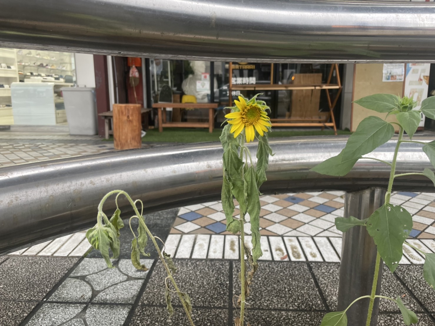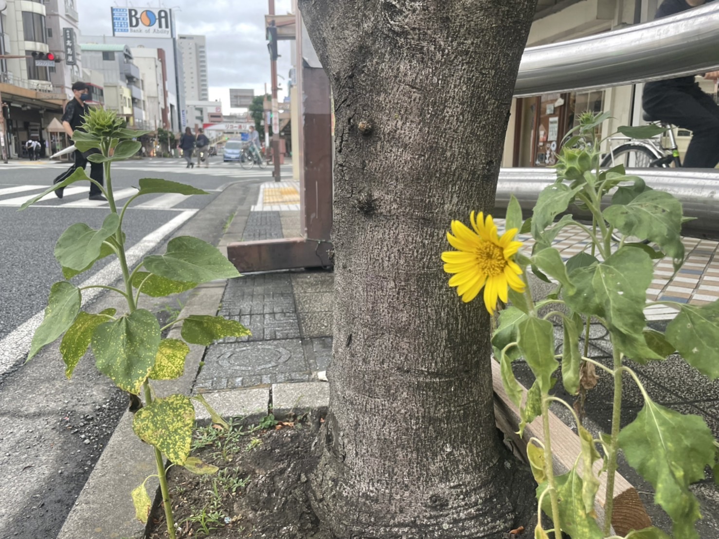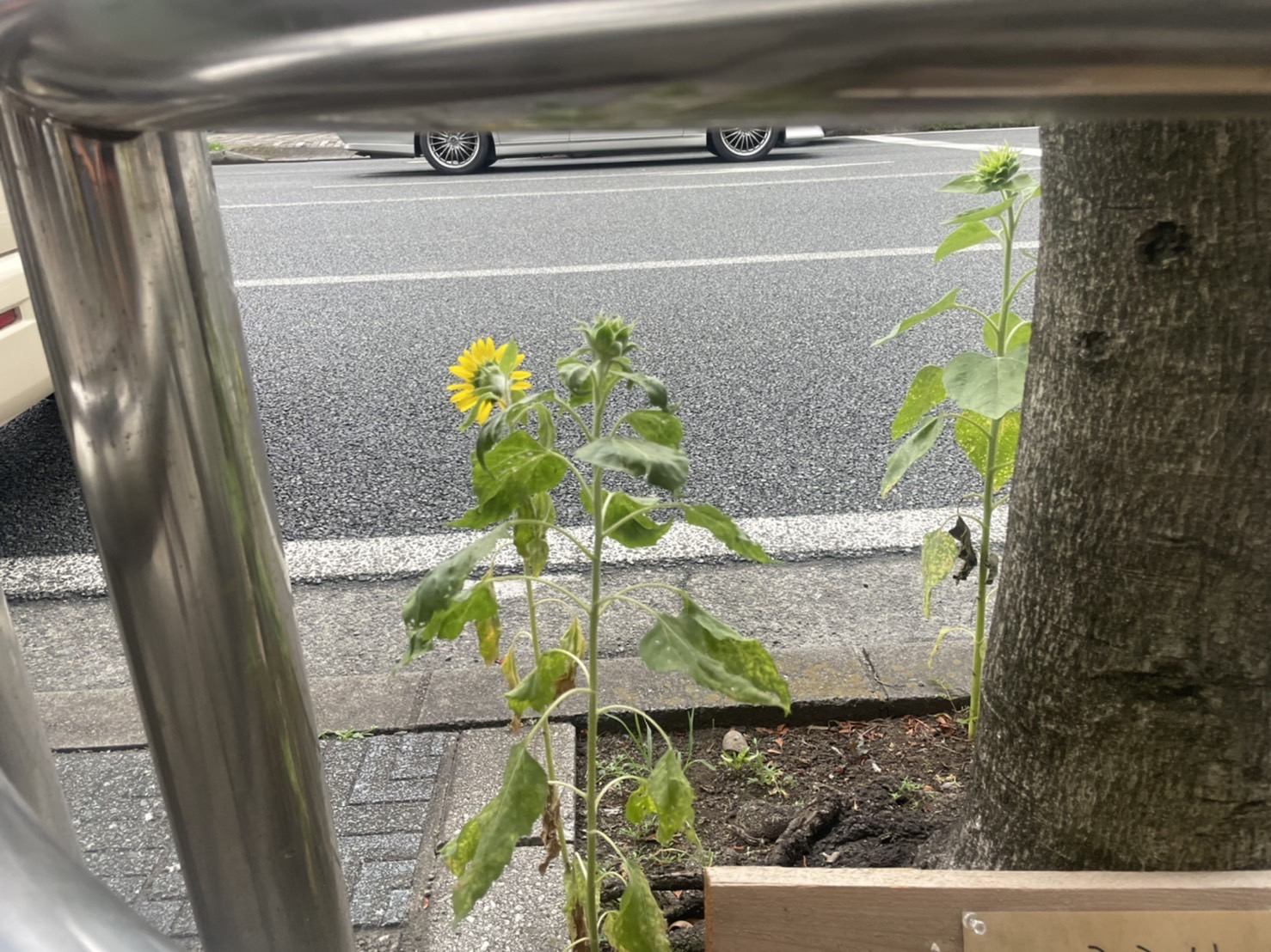 ついにひまわり咲いた。リコー通りのぬまつー基地前。4/27にタネ蒔いたやつ。(沼津市高島町)