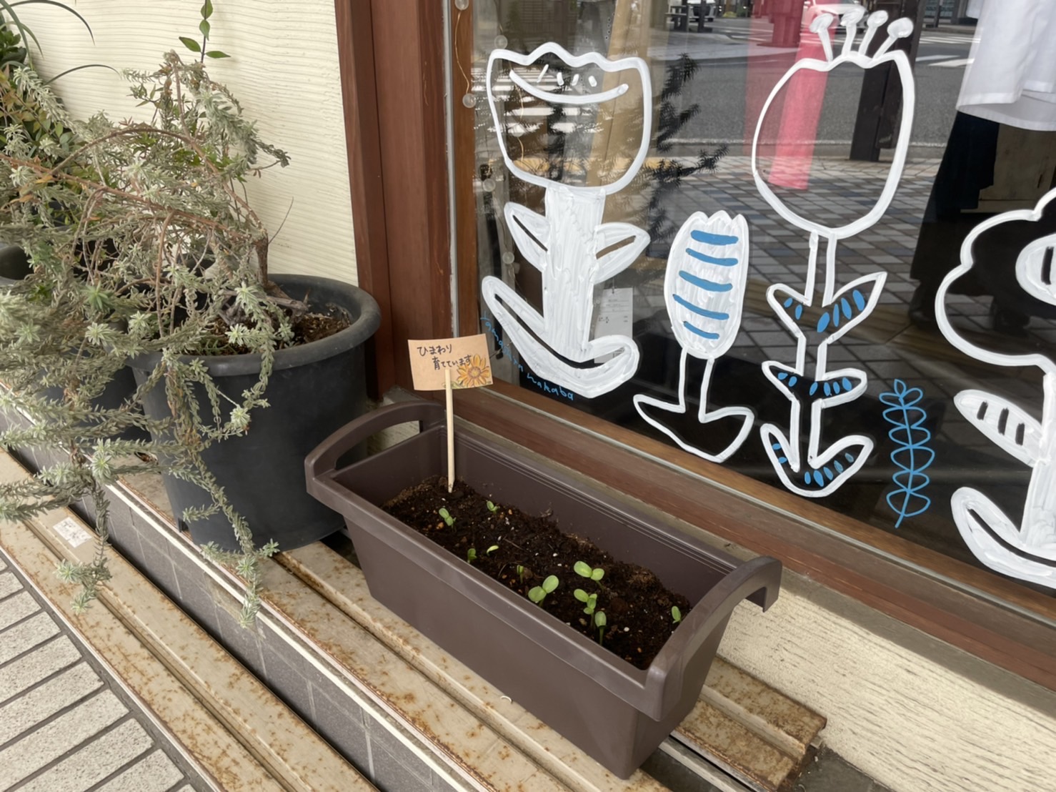 リコー通りのぬまつー基地前。ひまわりの芽、出てきた。ラブズも育ててる。より