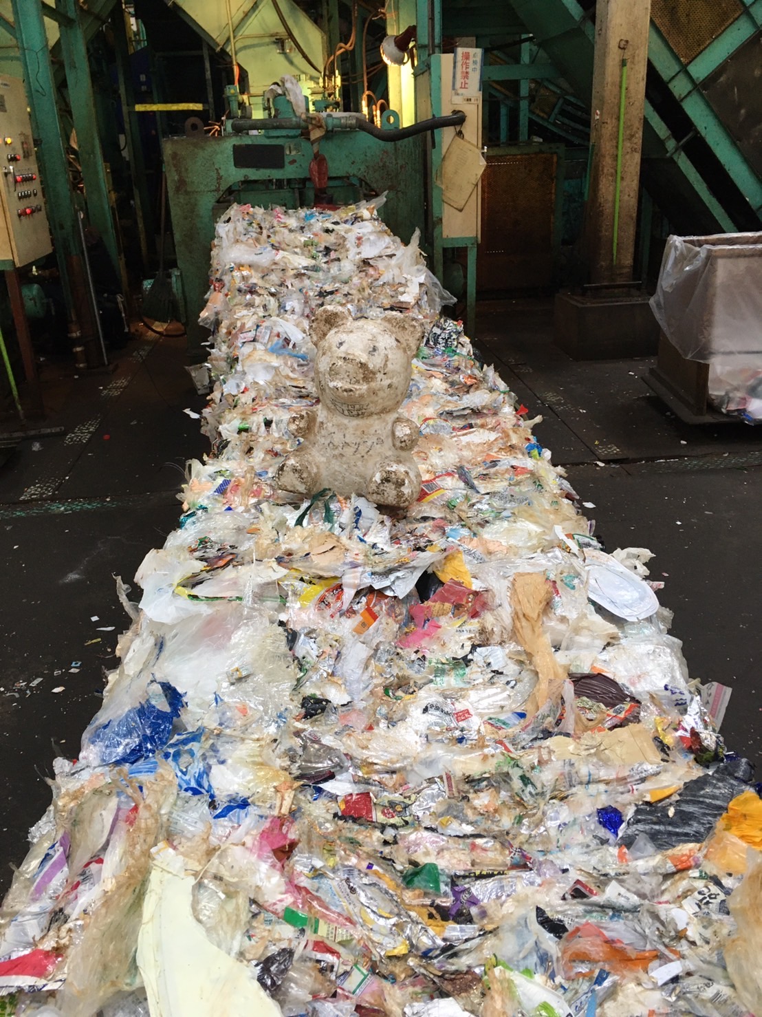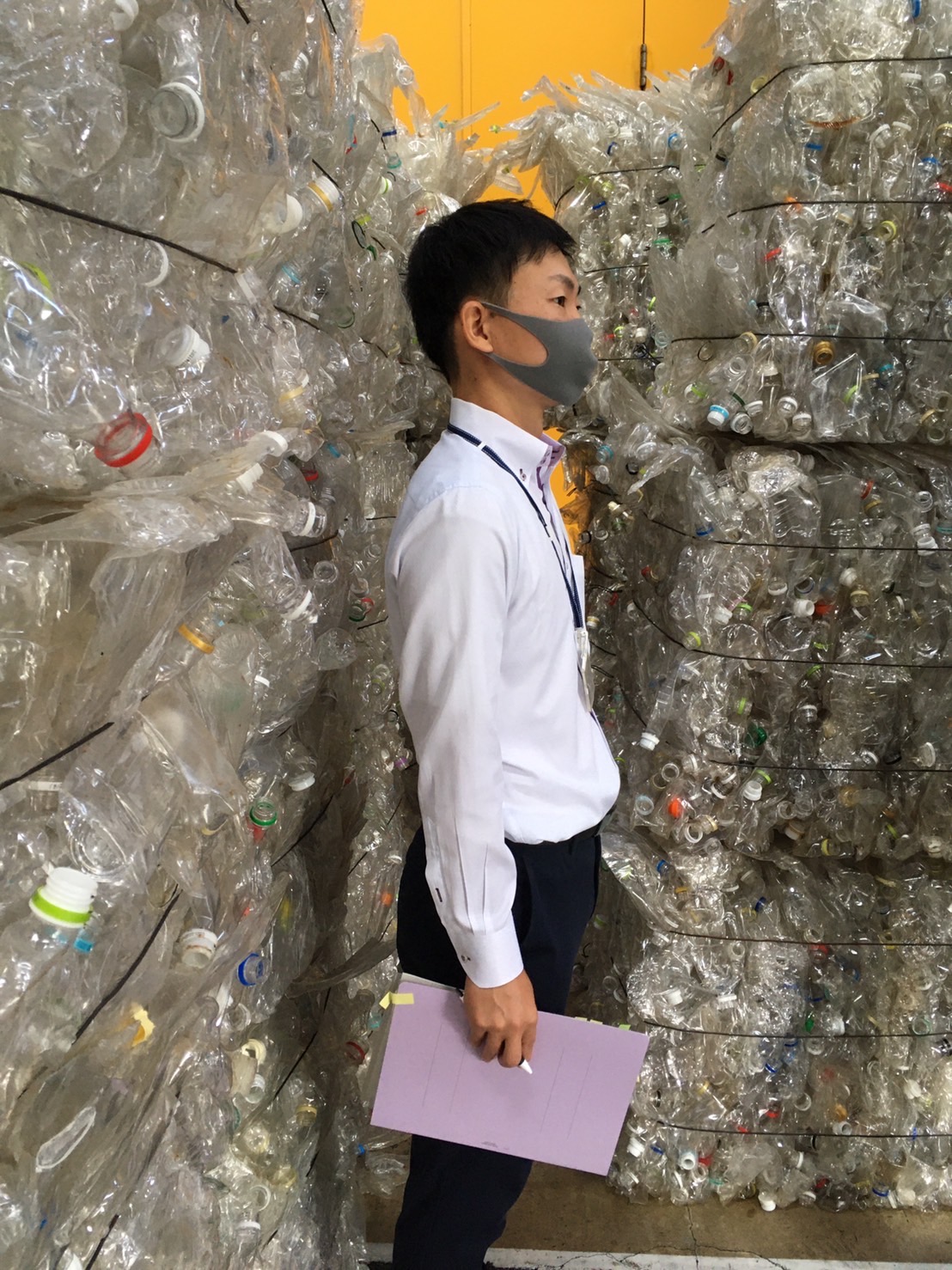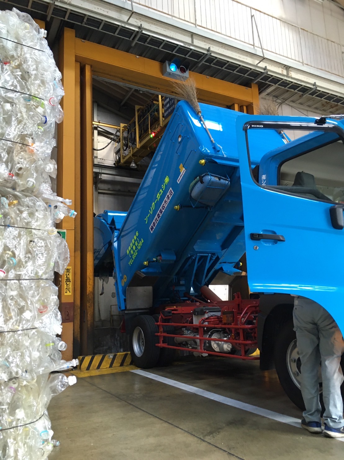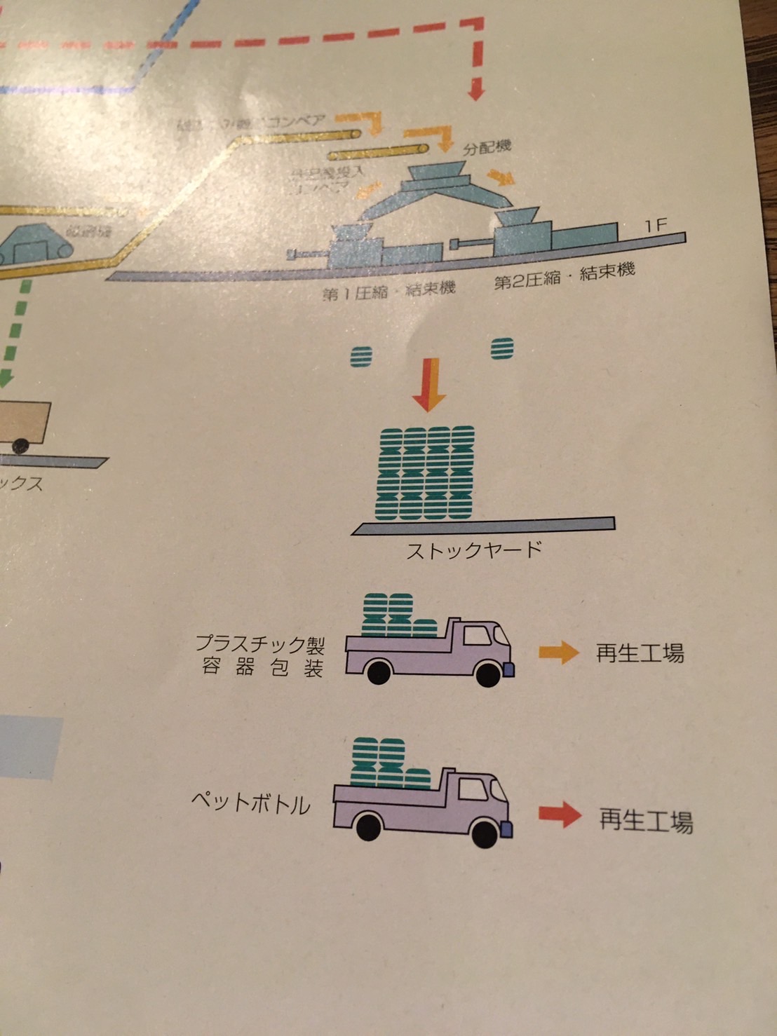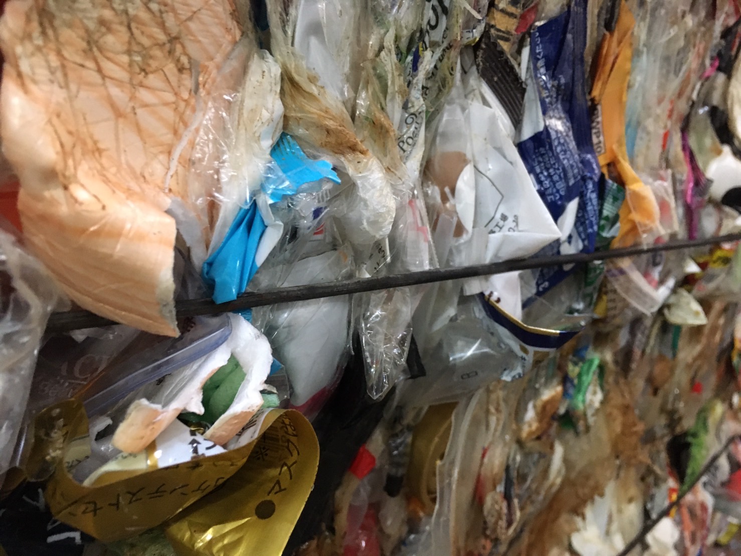 沼津市内の各地域で週1で収集されている「プラごみ」。ちゃんと言うと「プラスチック製容器包装」。「中継・中間処理施設で圧縮・結束処理を行い、リサイクル処理をしています」だそう。ペットボトルも同じようにリサイクル処理されている。