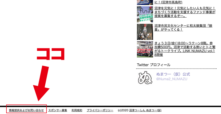 ずらーっと長いPC画面の一番下の一番下。ここをクリックするとフォームに行くことができますのでみなさんの沼津愛をゆるーくぶつけてください(繰り返しとなりますが必ず取材・掲載するとは限りませんw)。