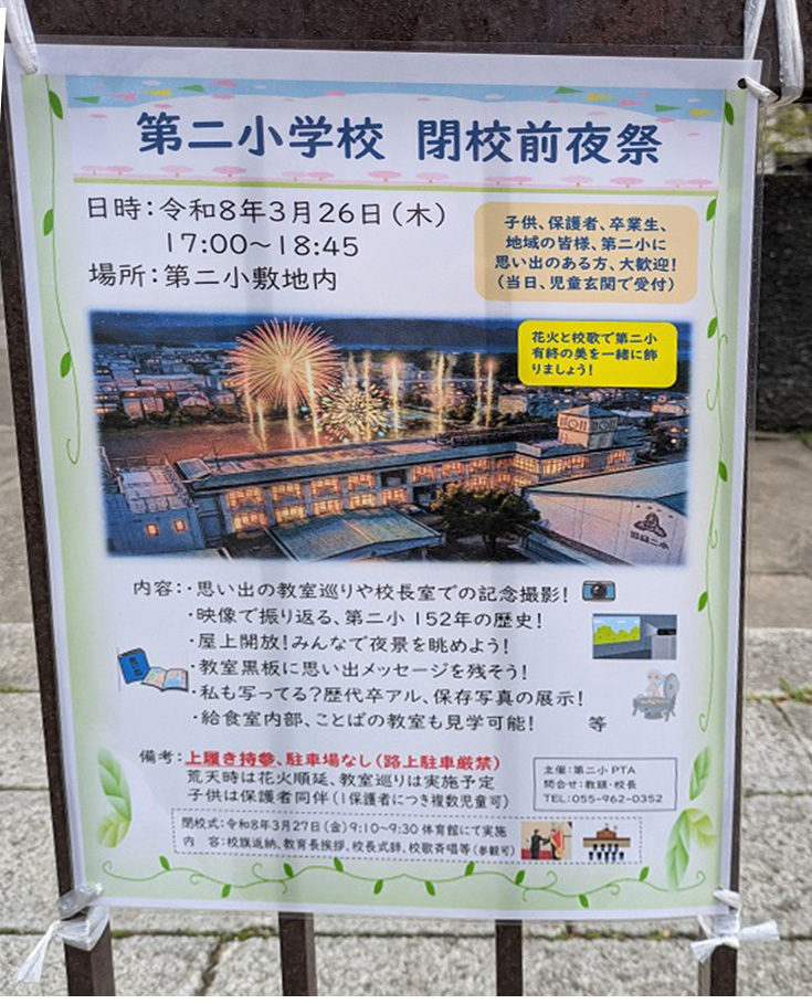 ついにこの日が来てしまいました。沼津のナンバースクールのひとつ、第二小学校が明日、3月27日に閉校の日を迎えます。そして、その前日(今日)にちょっと特別な前夜祭があるようです。