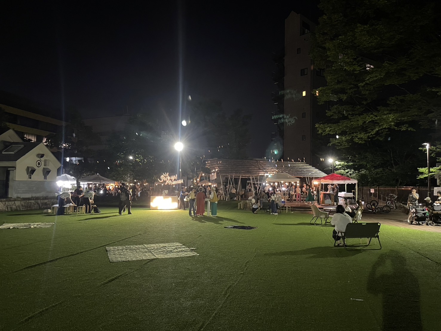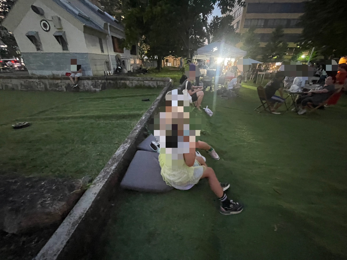 このへんは花壇だったっけ。実証実験の人工芝の上に、クッションが置いてあると、もうそこはソファーですね。