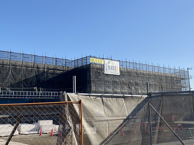 足場の黒いネットは「もうすぐ足場が外れるよ〜」感を演出しています。もう「建ってる感」がすごい。車で前を通ると、思わず二度見してしまうレベルです。