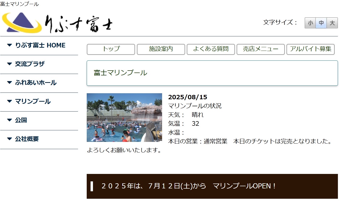 富士マリンプールは、富士市にあるんだけど、沼津からすぐのところにあるから、ぼくたち、沼津市民にとっても慣れ親しんだプール。小学生の頃、校区外は行っちゃダメだって言われてるのに、チャリでみんなで千本浜からマリンプールに遊びに来て、プールで遊んでる最中に、財布のお金を盗られて、凹んだのは、今となってはいい思い出。あと、なんか「マリンプールが無くなっちゃうかも!?」みたいなことをちょっと前にどこかで聞いた気がするけど、継続して営業してくれてありがたい。