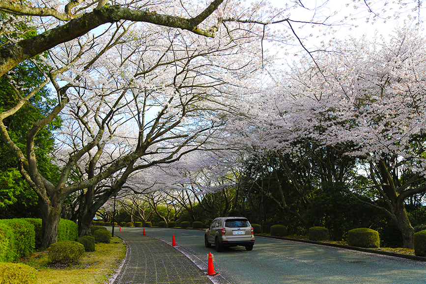 例年、春になると特に工場のエントランスあたりにエグいくらいにきれいな桜並木が出現します。なんかもう、車のCMに使えそうなくらい。