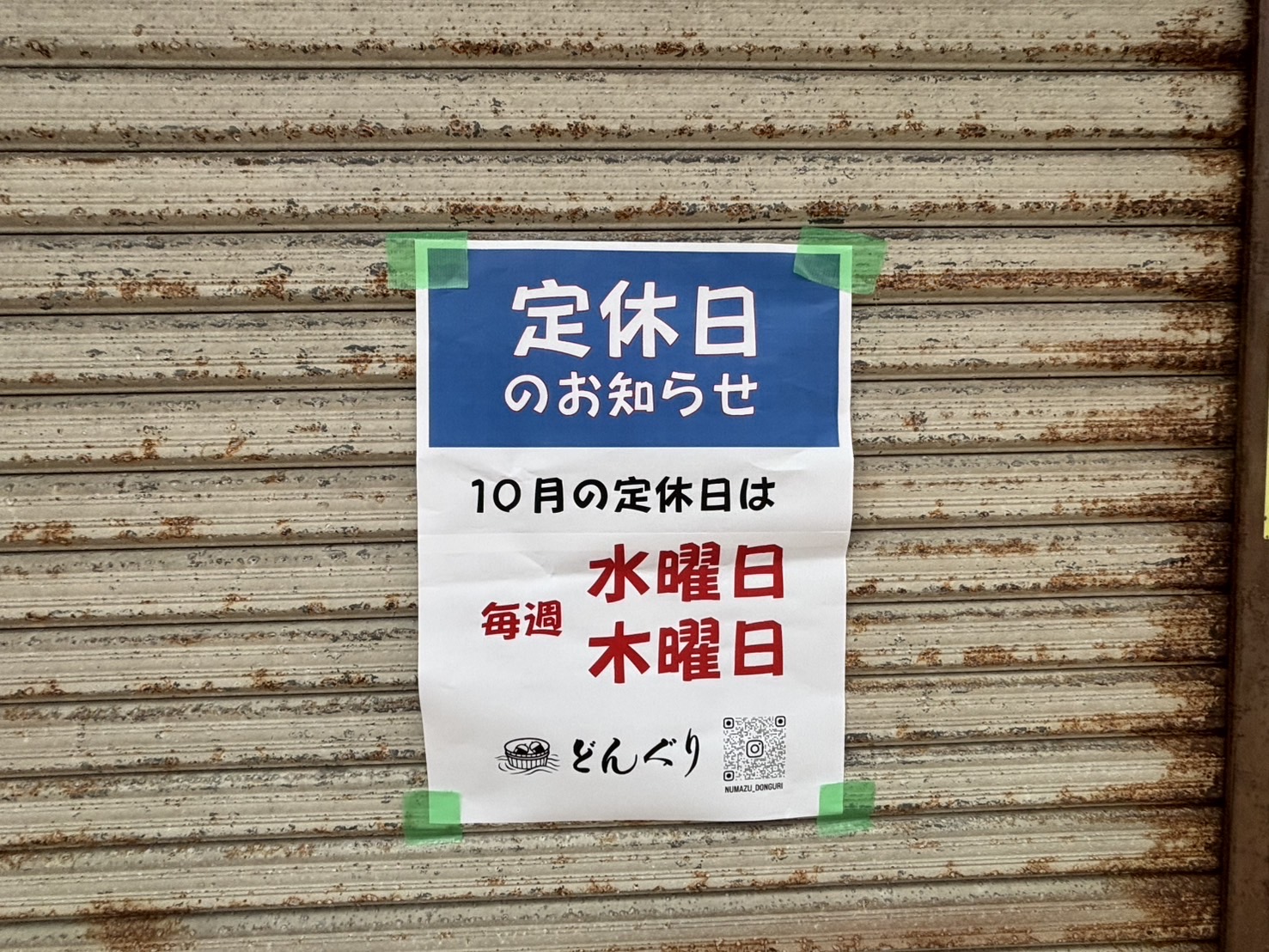お知らせしてた。10月は、毎週、水曜日・木曜日が定休日だそう。