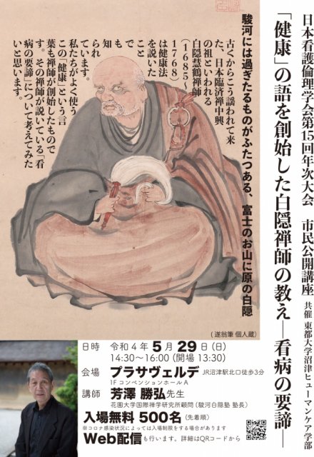2021年度に沼津市に開学した東都大学沼津ヒューマンケア学部の学部長さんが大会長として開催する日本看護倫理学会第15回年次大会(なんかすごそう)では、市民公開講座として、白隠さんにちなんだ講演会を実施するそうです。