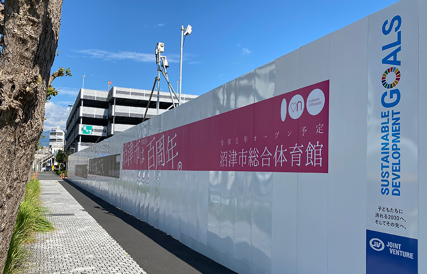 そういえば、沼津市制100周年関連はなにかとピンクが多いですね。体育館つくってるときのながーい看板とか。コレがピンクの先駆けかも。