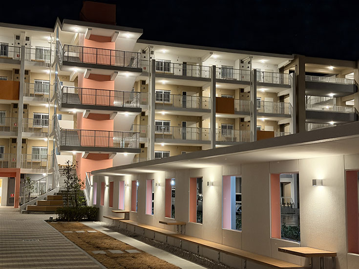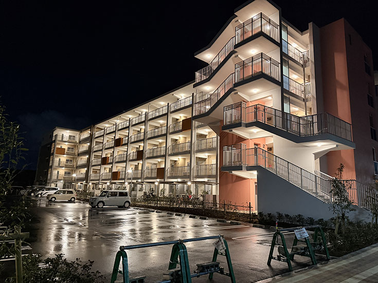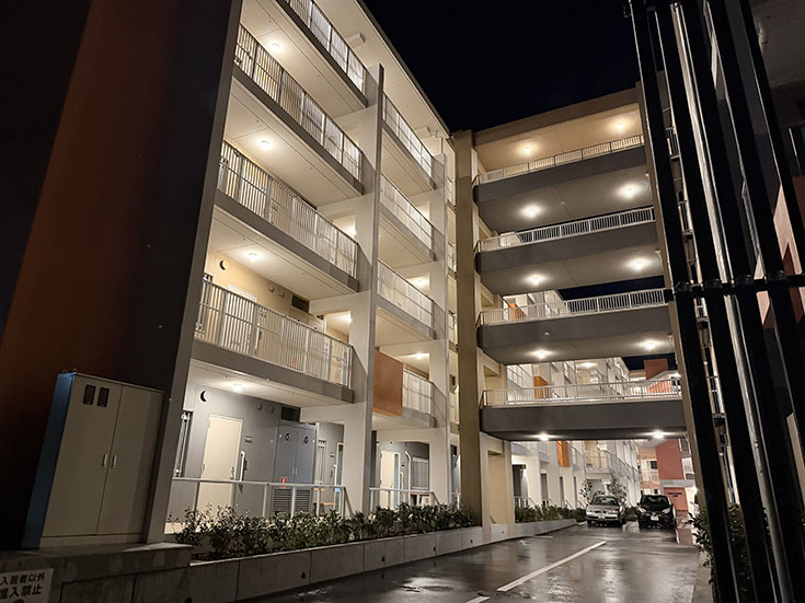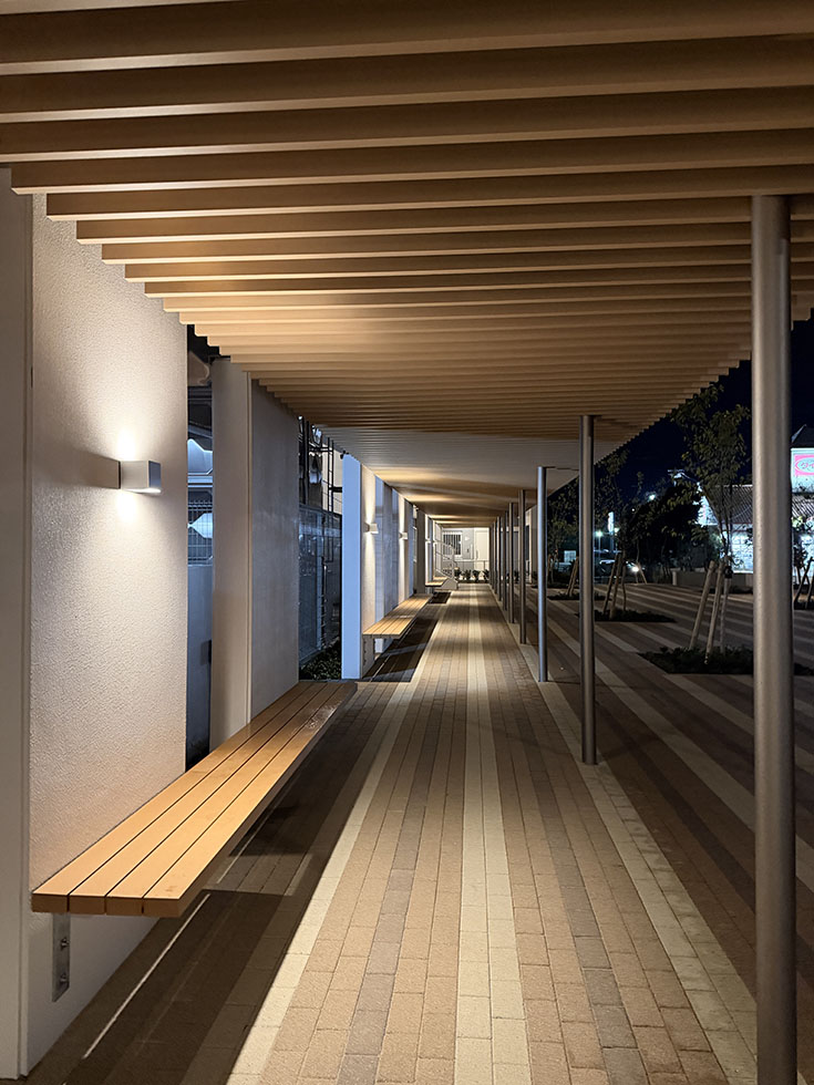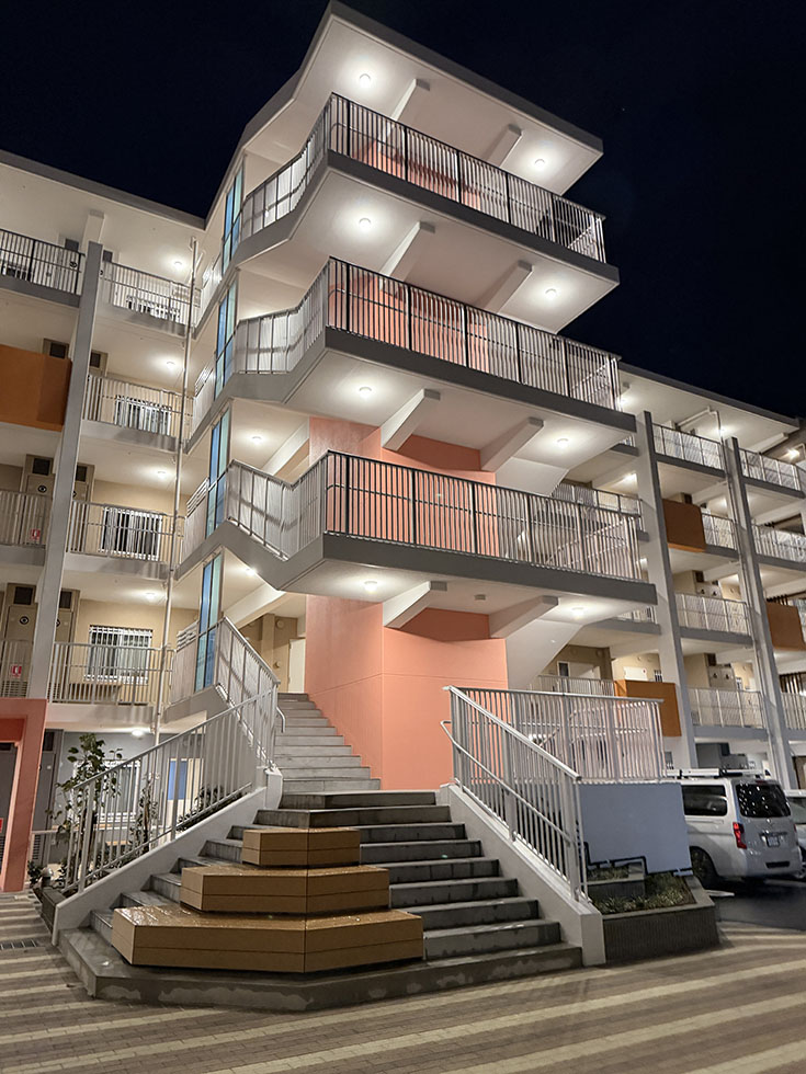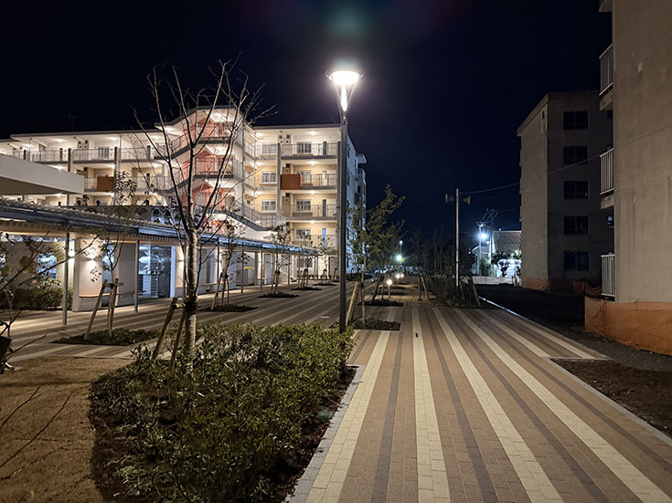 リニューアルした県営原団地。夜はなんかオシャンティ。そして座れるところもいっぱい。