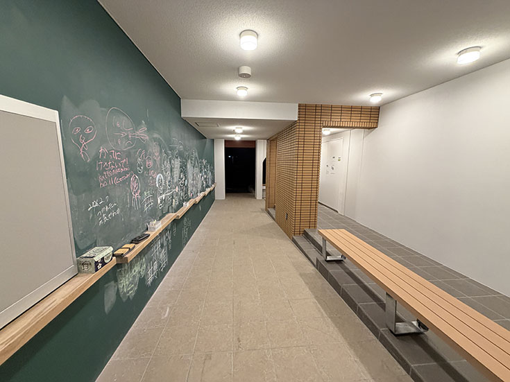 キッズが黒板に自由に描けるスペースのところにも座れそうな感じのところ。もういろんなところで井戸端会議みたいのできそうですね。