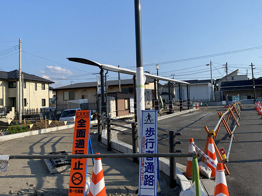 タクシー乗り場になるのか送迎待ちの場所になるのか、屋根付きのシェルターみたいなものができあがっています。
