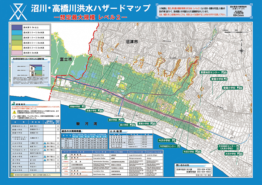 各ハザードマップは対象地域に全戸配布しているそうなので、狩野川沿いの人には「狩野川・黄瀬川洪水ハザードマップ」が。そして、7月にも被害のあった沼川・高橋川近くに住む人たちには「沼川・高橋川洪水ハザードマップ」があるはずです。他にも新中川の洪水ハザードマップも。