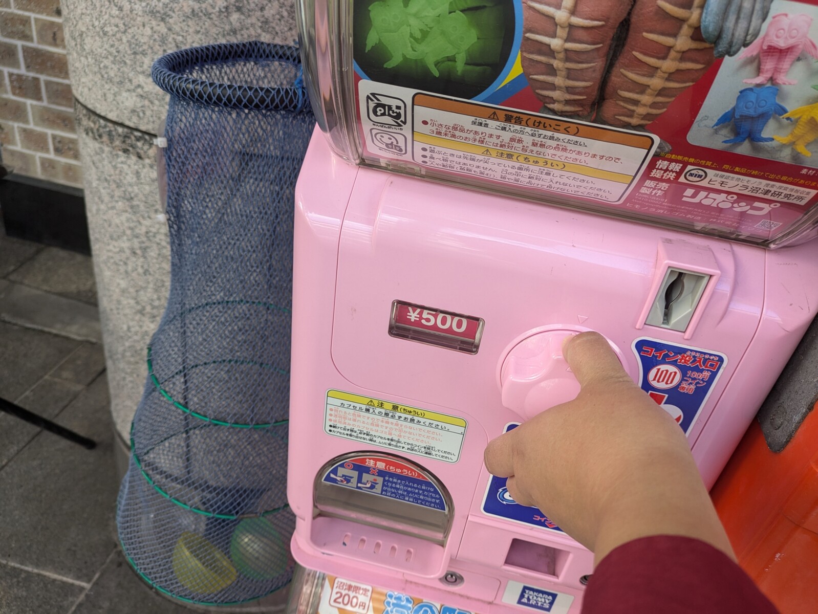 以前、沼津市上土町のマルサンホビーの入り口で見つけて、まわせなかったヒモノラガチャ。