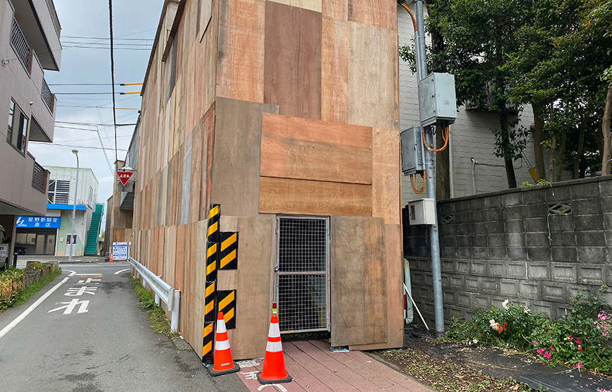 歩道橋全体が板で覆われていて要塞みたい。ちょっとワクワクするビジュアル。