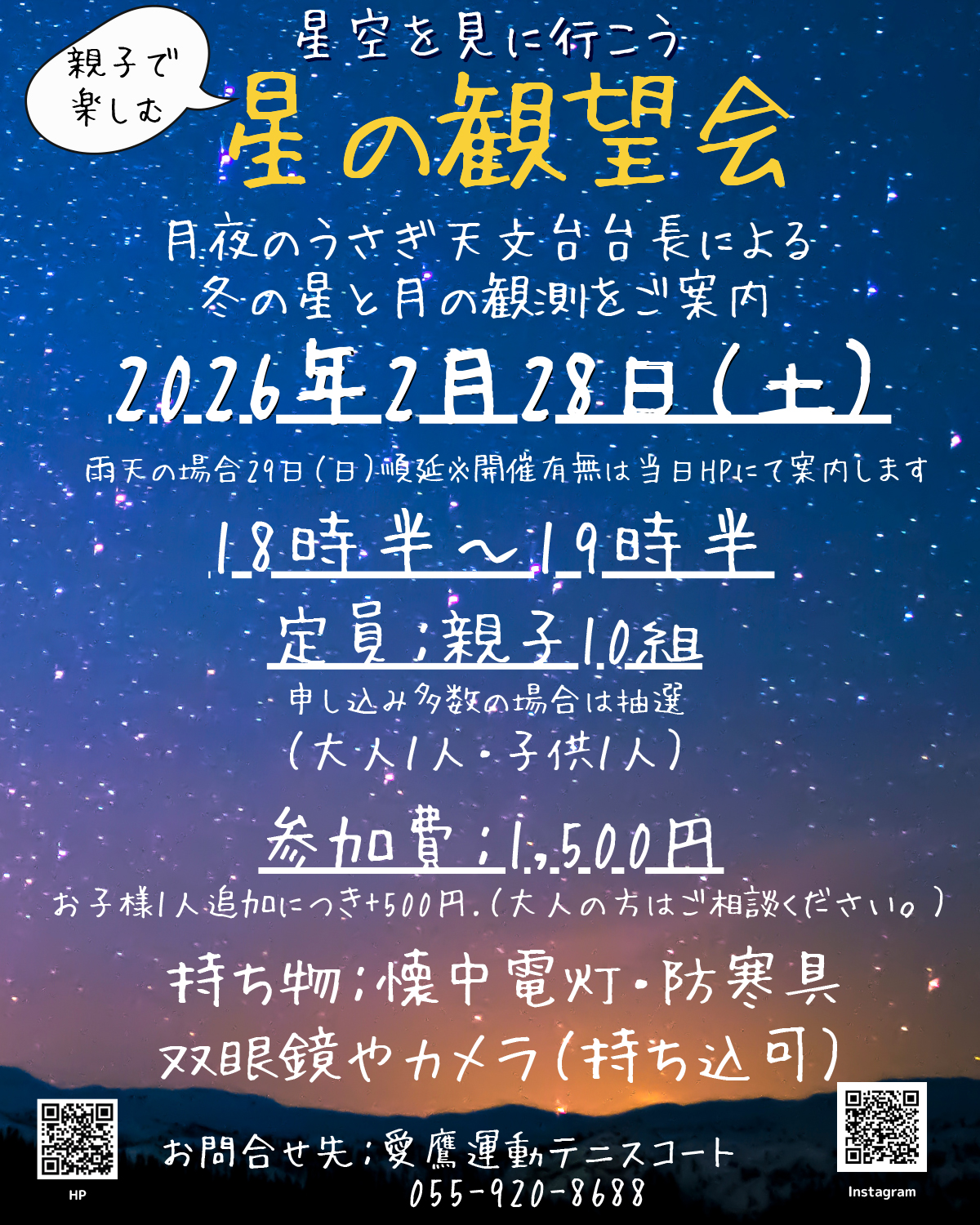 2月28日の夜、愛鷹運動公園テニスコート北側の芝生広場で星の観望会が開催されるようです。