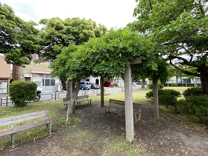 暑いときは藤棚っぽいパーゴラの下のベンチで休憩できそう。