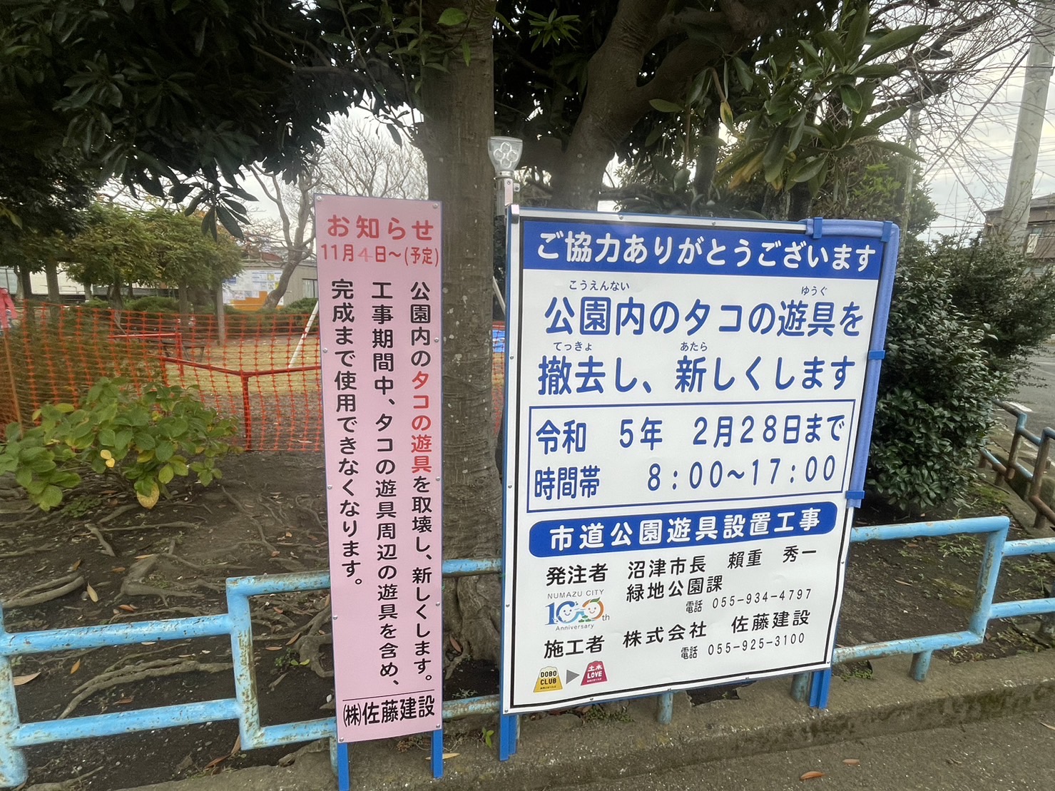 令和5年2月28日まで。公園内のタコの遊具を撤去し、新しくします。なんだって。
